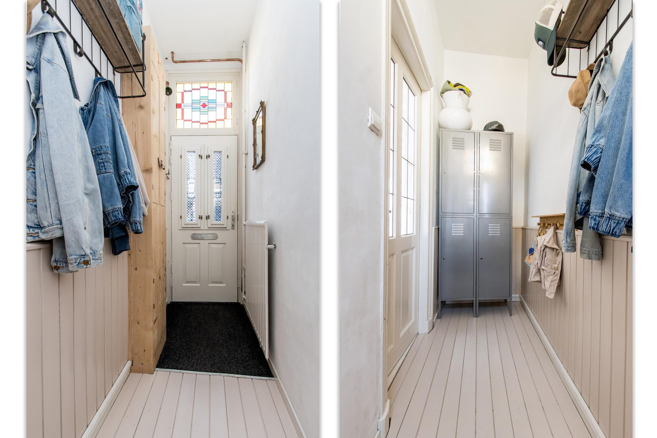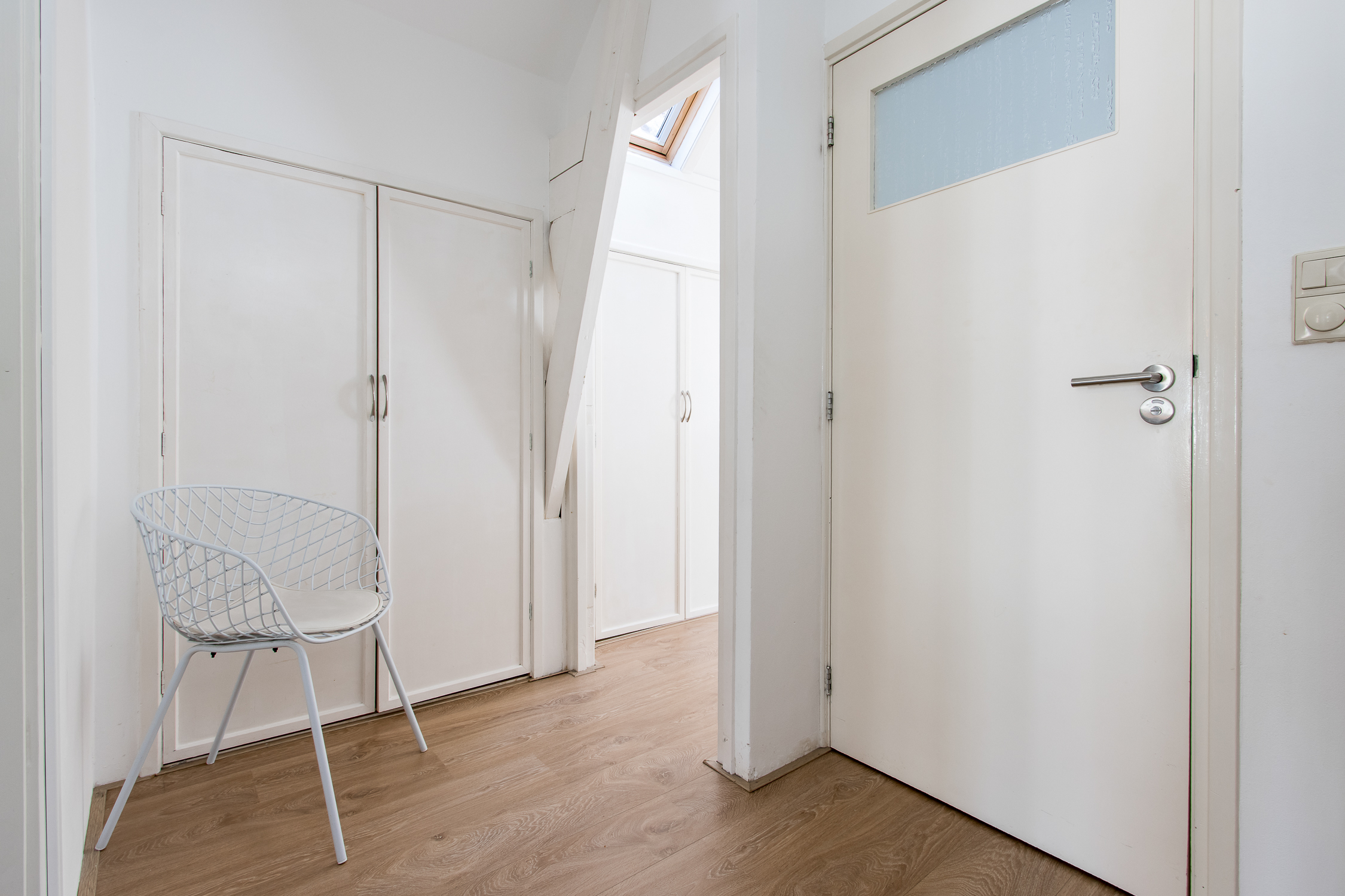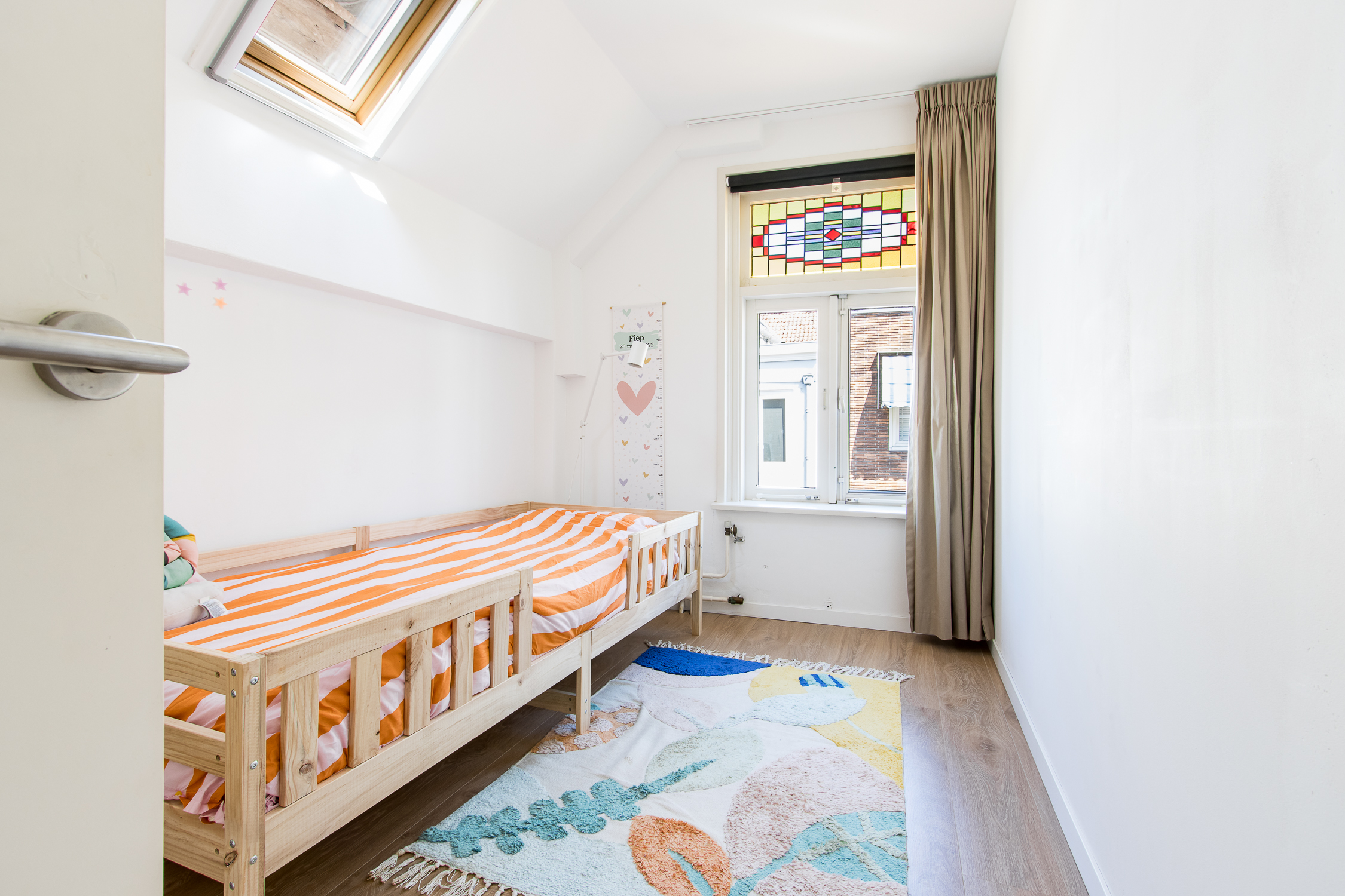 Eerste verdieping: de trapopgang in de woonkamer leidt naar de eerste verdieping. Hier geeft de overloop toegang tot een comfortabele badkamer en drie lichte slaapkamers. Aan de voorzijde zijn twee kamers gecreëerd, elk met karakteristieke glas-in-lood bovenlichten en Velux dakvensters die het ochtendlicht binnenlaten. De slaapkamer aan de achterzijde beschikt over ingebouwde wandkasten, drie dakramen en openslaande deuren naar het zonnige dakterras. De badkamer is modern en verzorgd afgewerkt met een inloopdouche, toilet en badkamermeubel. Dankzij het dakraam is er veel natuurlijk licht en ventilatie, naast de aanwezige mechanische ventilatie.