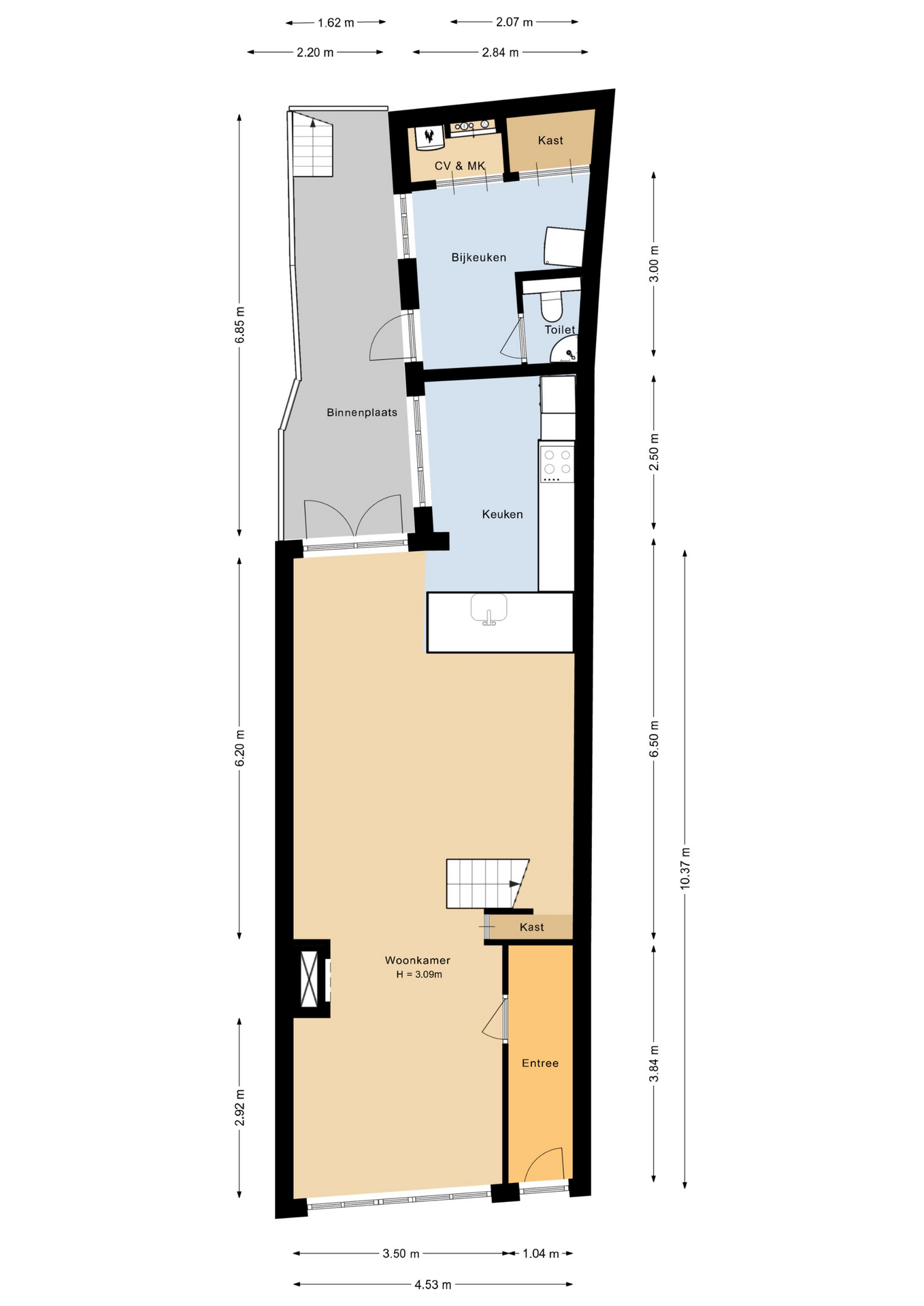Indeling woning: via de fraaie hardhouten voordeur met glas-in-lood bovenlicht stap je de hoge entreehal binnen met doorkijk naar de leefruimte. In de woonkamer zorgt het bijna drie meter hoge balkenplafond voor een ruimtelijk gevoel en zorgt aan de voorzijde de geluidswerende pui voor veel lichtinval. De living staat in open verbinding met de strak vormgegeven keuken, voorzien van L-vormige keukenunit met greeploze witte lades en hoogwaardige inbouwapparatuur. Grenzend aan de keuken bevindt zich de praktische bijkeuken met toiletruimte en vaste kastenwand. Hier zijn de witgoedaansluitingen en de CV-ketel netjes weggewerkt. Via een klassieke buitendeur met roedeverdeling stap je de besloten binnenplaats op, gunstig gelegen op het zuidwesten.