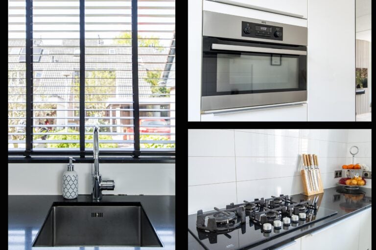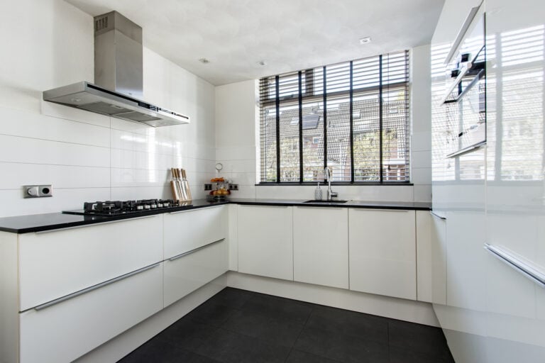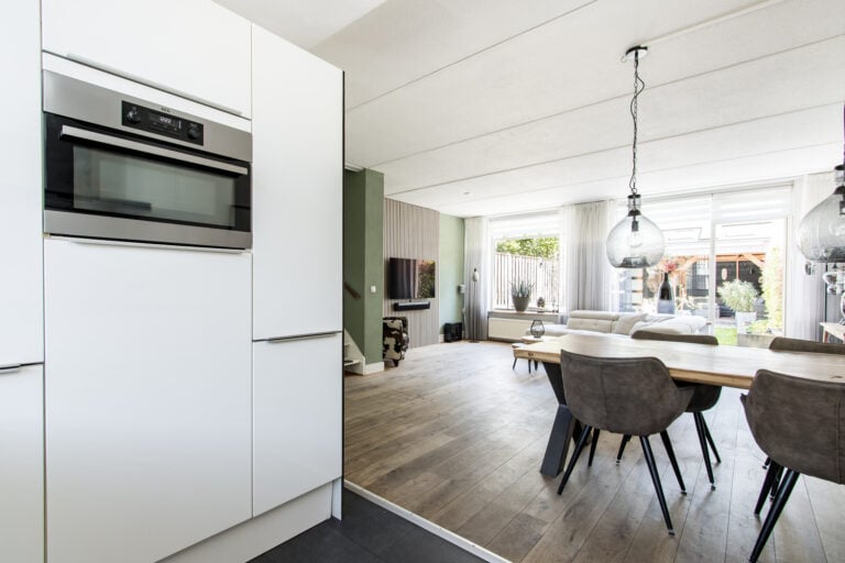 De woning kenmerkt zich door een fijne, tuingerichte woonkamer met grote raampartijen, waardoor het daglicht rijkelijk naar binnen valt. Aan de voorzijde bevindt zich de moderne hoekkkeuken, strak vormgegeven en voorzien van diverse inbouwapparatuur. Een prettige plek waar koken en contact met de leefruimte samenkomen.