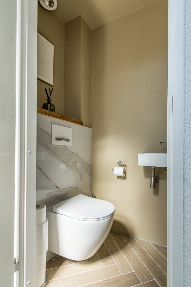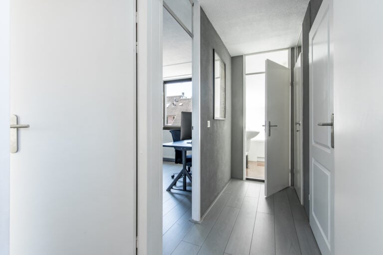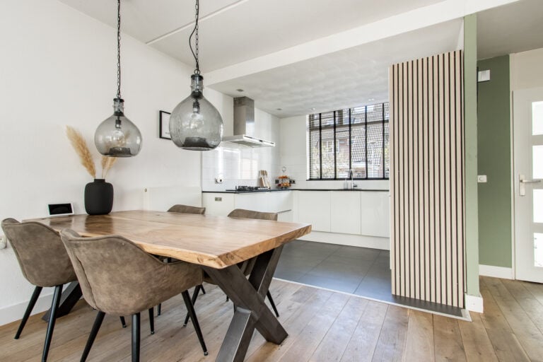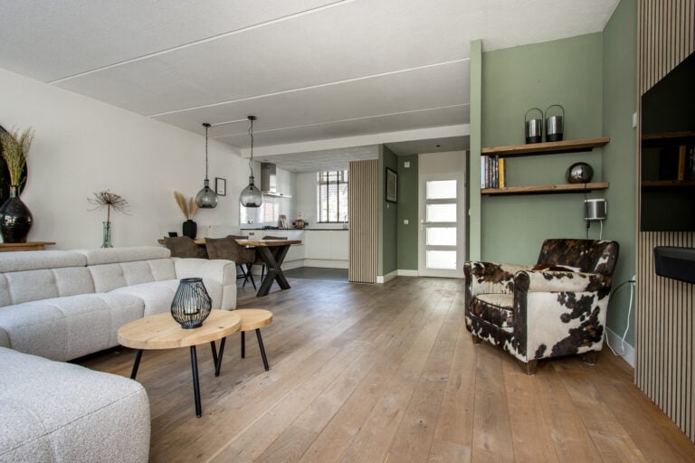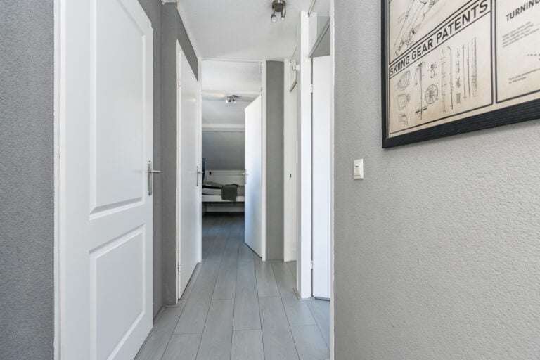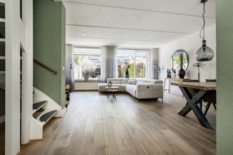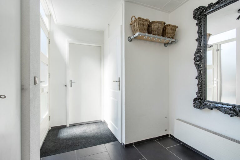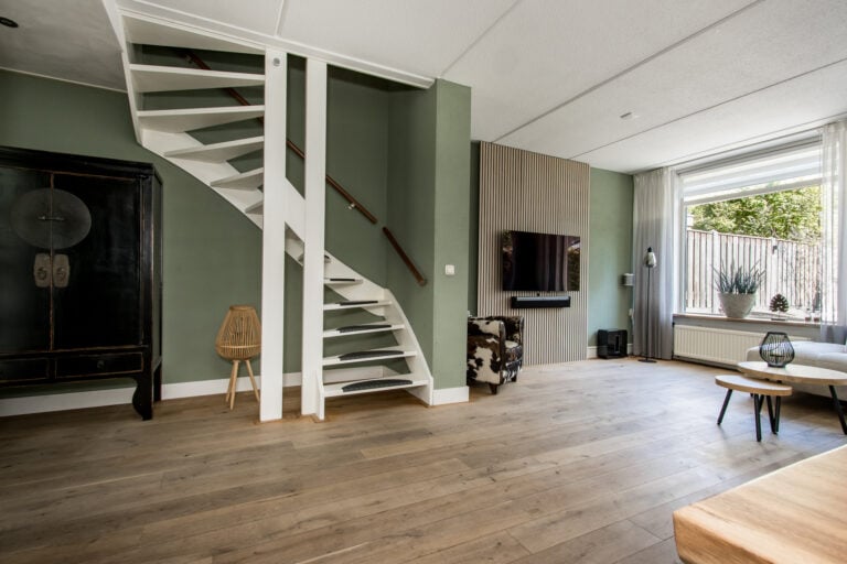 De indeling is als volgt: de entree geeft toegang tot de hal met garderobe, meterkast en een gerenoveerde toiletruimte. Vanuit hier stap je de ruime en lichte woonkamer binnen, voorzien van fraaie wandpanelen, een praktische trapkast en de trapopgang naar de eerste verdieping. De loopdeur zorgt voor een directe verbinding met de achtertuin.