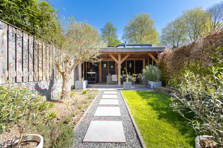 • verzorgde achtertuin op het noordoosten met vrijstaande houten overkapping;
