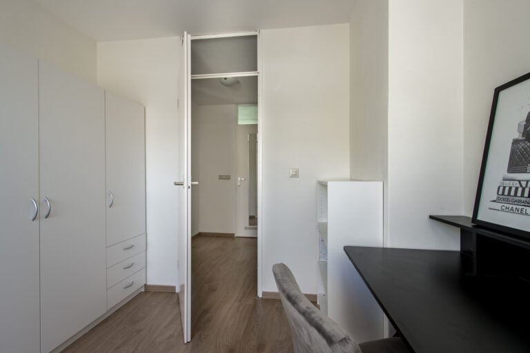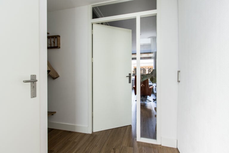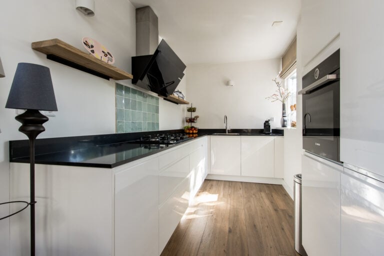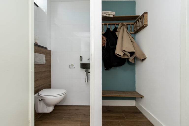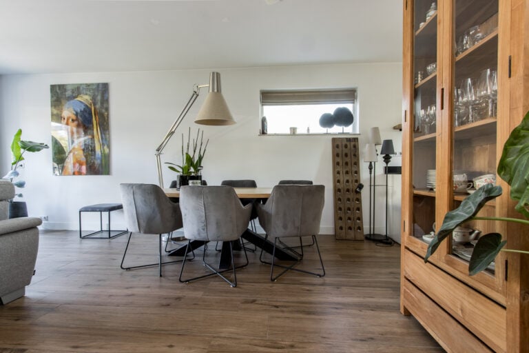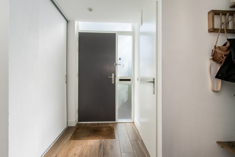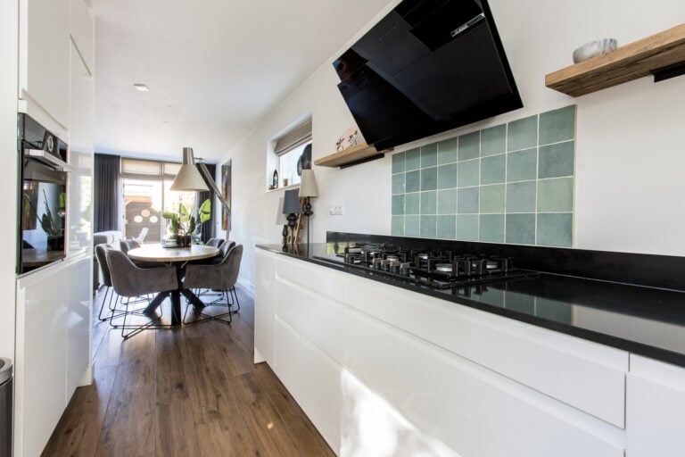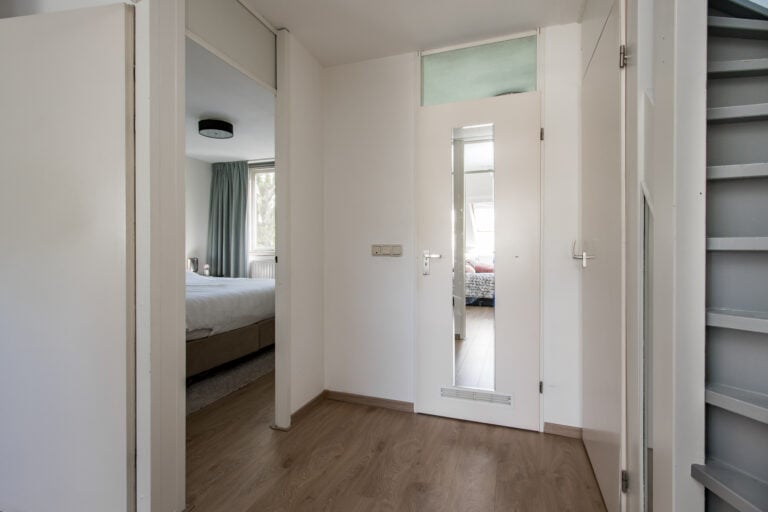 De indeling van de woning is als volgt: je komt de woning binnen aan de voorzijde, waar de entree zich bevindt. In de hal vind je een vaste kast met schuifdeur en de meterkast, evenals de toiletruimte met wandcloset en handwasfonteintje. Ook is hier ruimte voor een garderobe. Vanuit de hal loop je door naar de royale woonkamer met open keuken. De living is ruim en licht dankzij de grote raampartijen, waardoor binnen en buiten op een prettige manier met elkaar verbonden worden. Aan de voorzijde van de woning ligt de moderne keuken, uitgevoerd met diverse inbouwapparatuur, waaronder een heteluchtoven, Quooker, vaatwasser, 4 gaspitten met wokbrander, afzuigkap, koelkast en vriezer. Een fijne plek waar koken en samenzijn moeiteloos samenkomen.