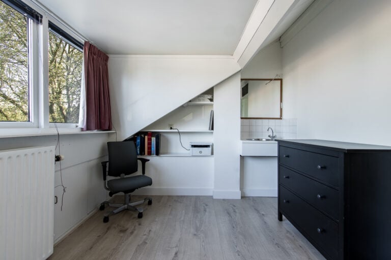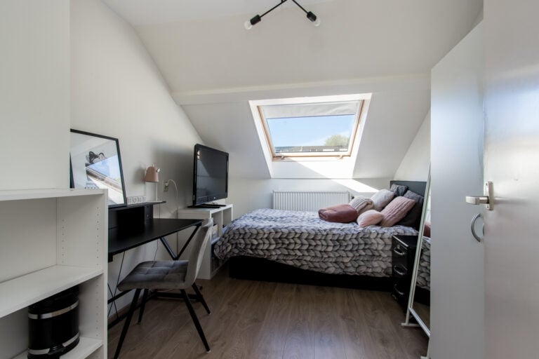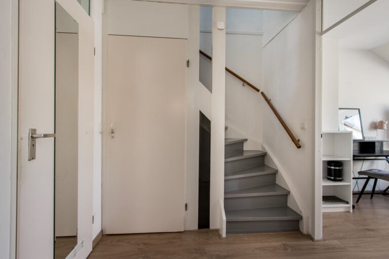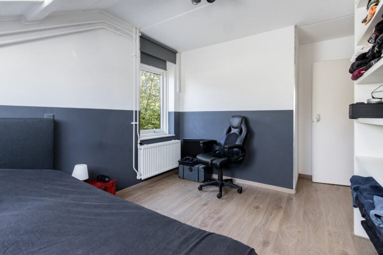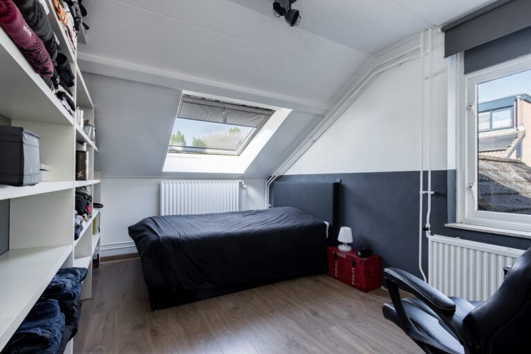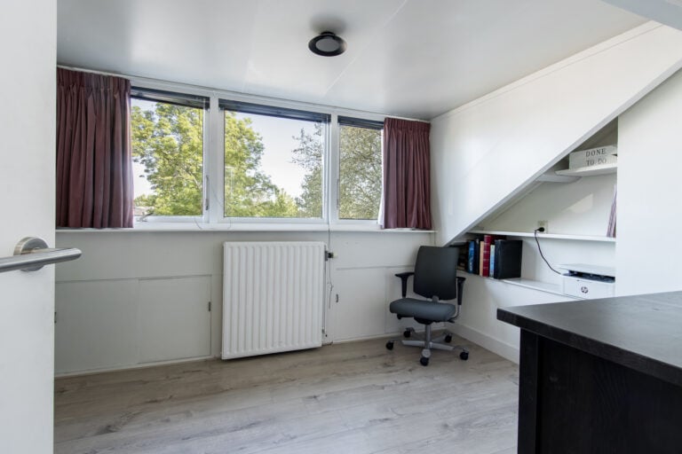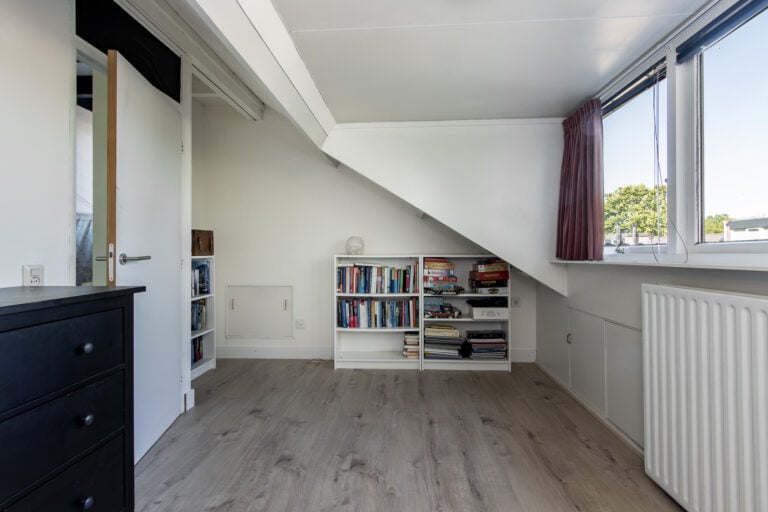 Tweede verdieping: de tweede verdieping is bereikbaar via een vaste trap. Hier kom je op de voorzolder met aansluitingen voor witgoed, de C.V.-installatie, mechanische ventilatie-unit en de omvormer van de zonnepanelen. Aansluitend bevindt zich nog een extra slaap- of hobbykamer, voorzien van een dakkapel en een wastafel, waardoor deze ruimte zeer veelzijdig inzetbaar is.