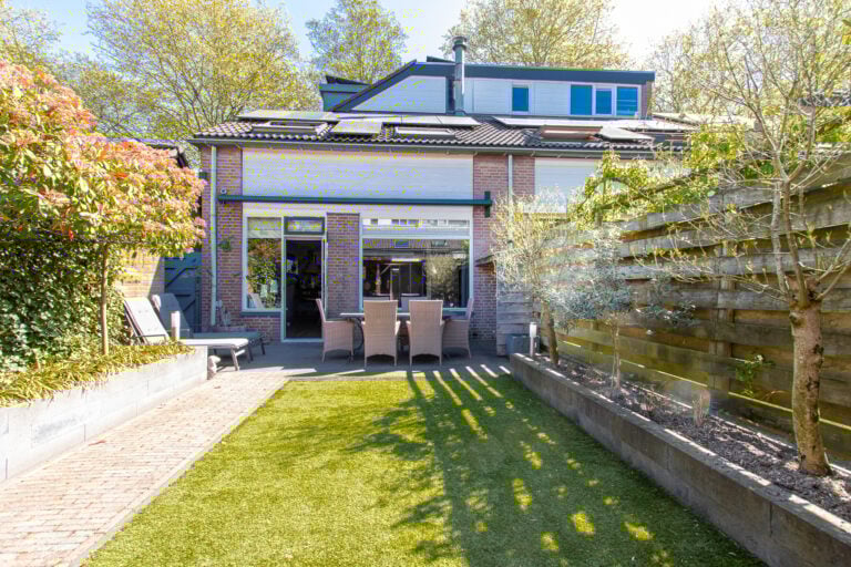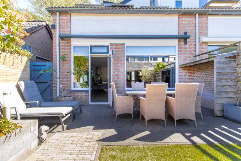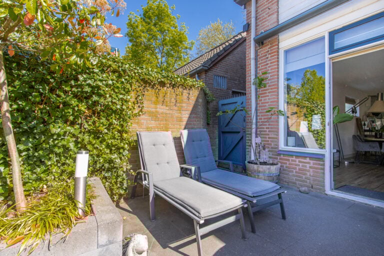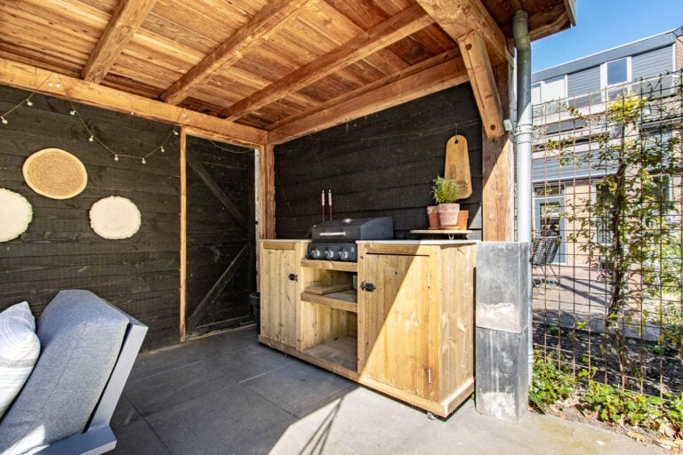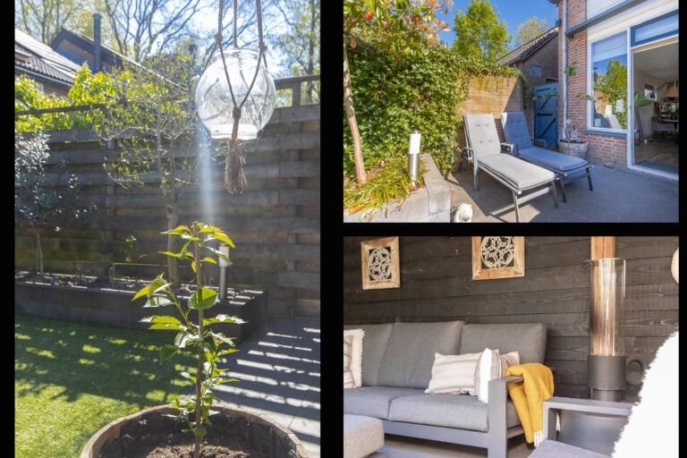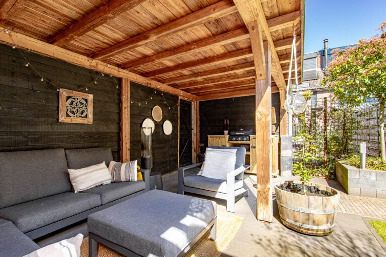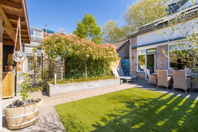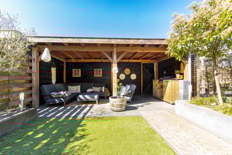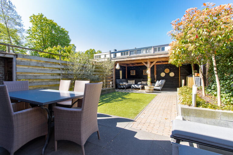 En dan de tuin… gelegen op het zonnige zuidwesten, perfect om tot in de avonduren te genieten. Achterin de tuin staat een sfeervolle houten overkapping: een heerlijke plek voor lange zomeravonden, borrels met vrienden of juist een rustig moment voor jezelf. Aan de voorzijde vind je een nette voortuin met toegang tot de entree en een handige stalling/berging voor fietsen.