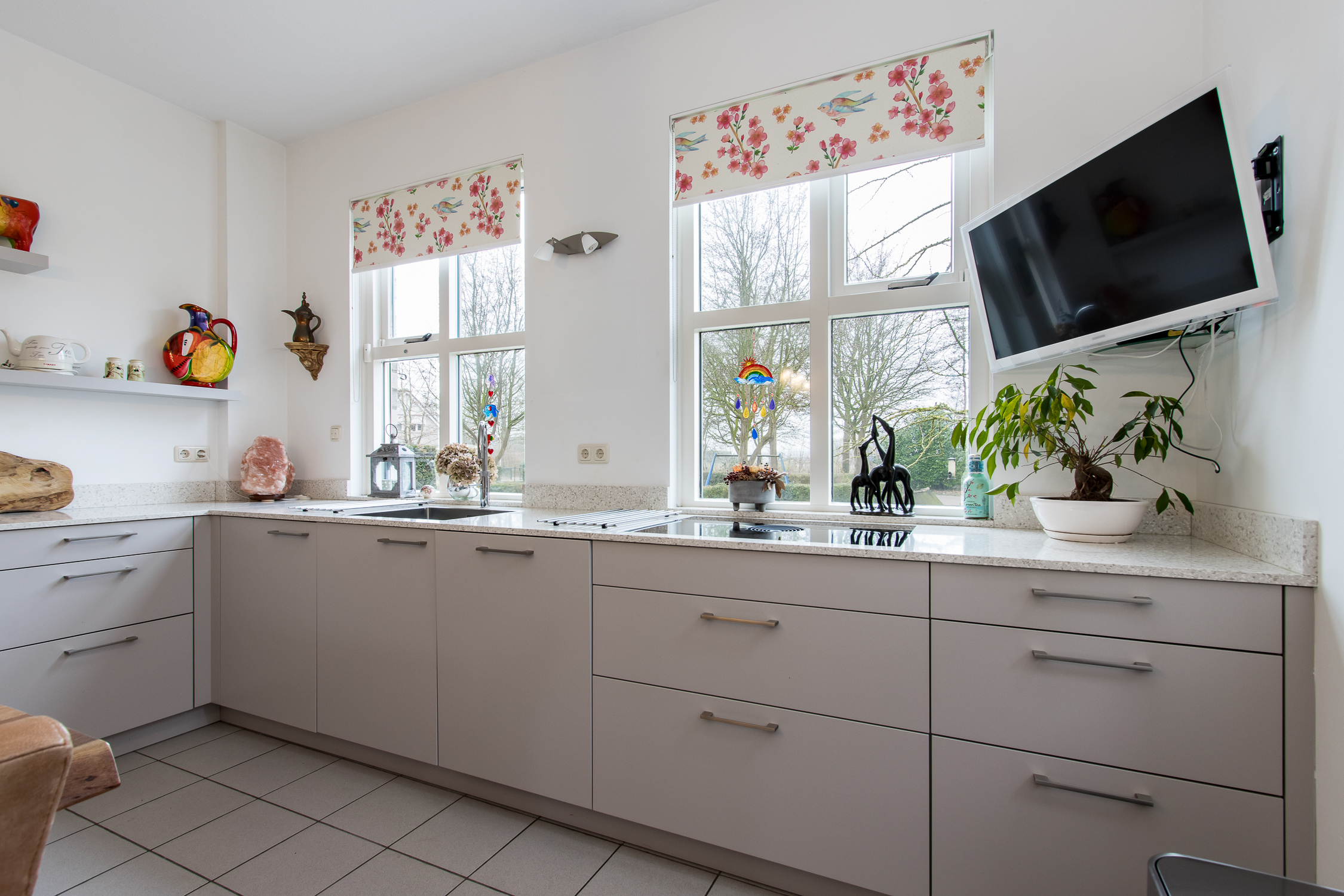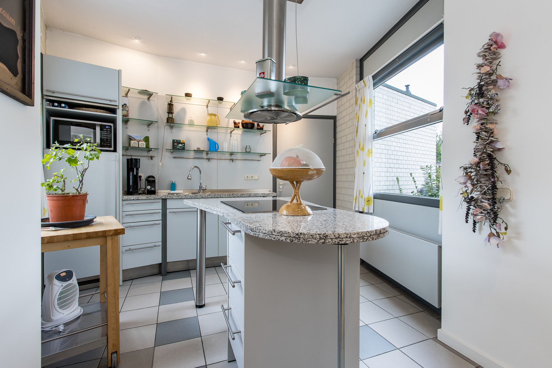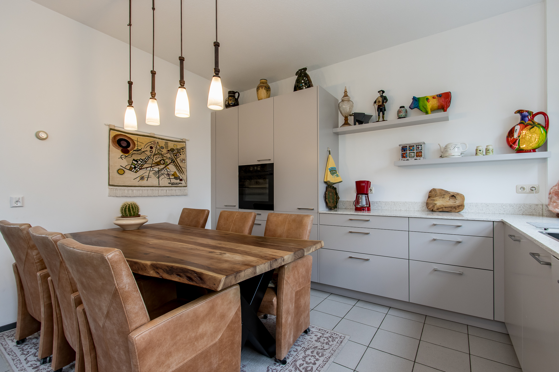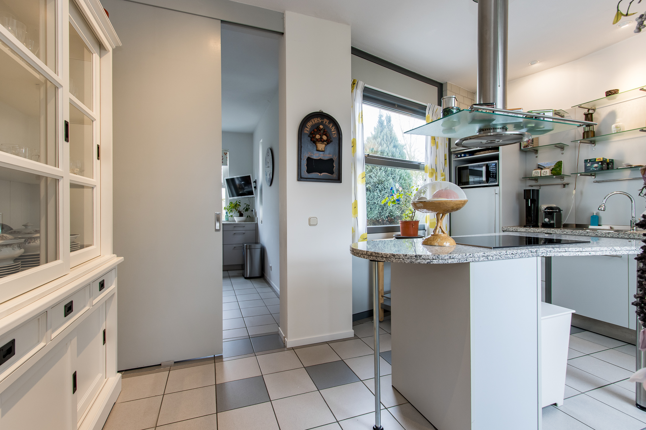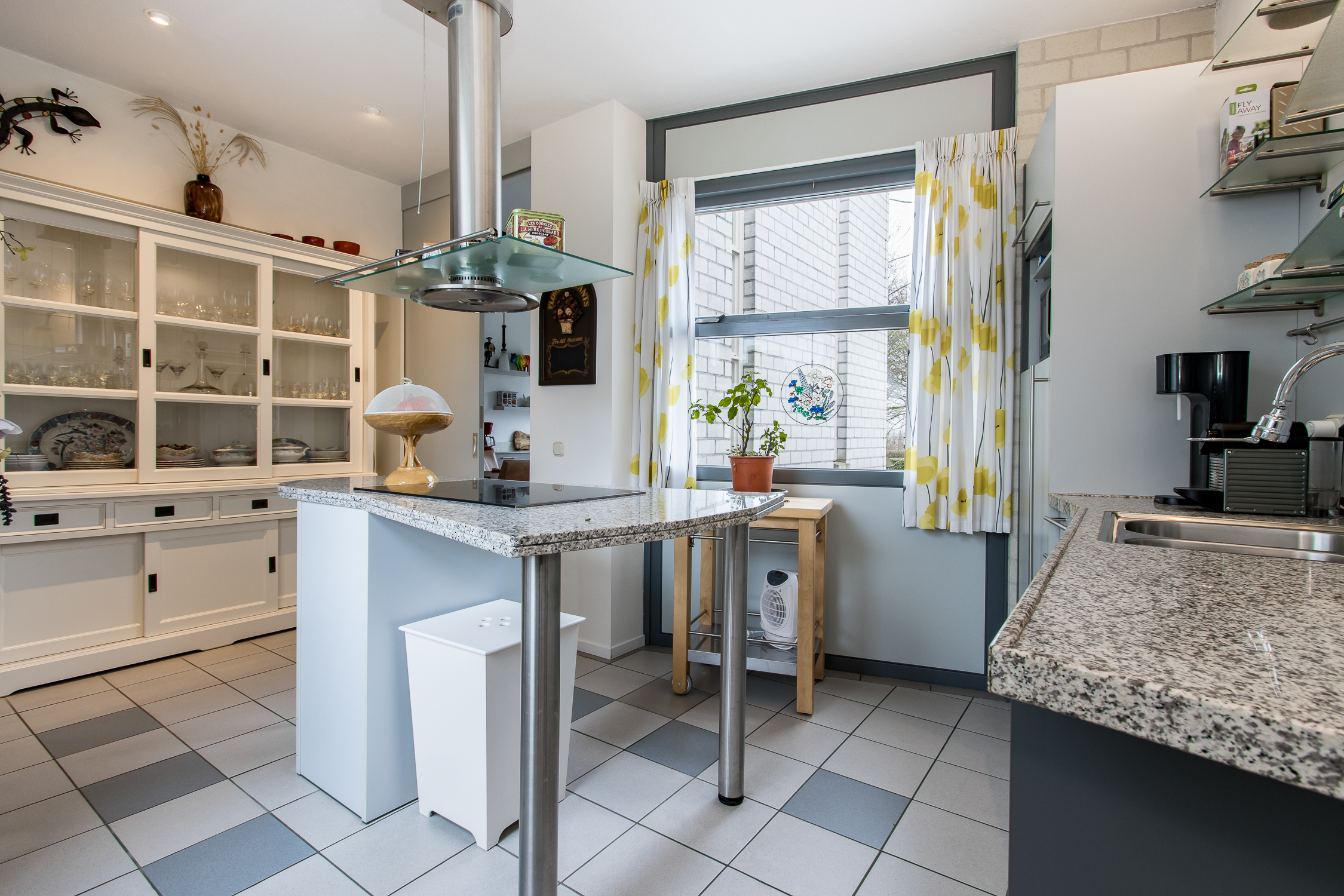 De lichte woonkamer is gelegen aan de achterzijde en biedt een prachtig uitzicht op de fraai aangelegde achtertuin. De woonkamer beschikt over een airco tevens verwarmingsunit van 2023. In voor-en najaar kan hiermee de kamer verwarmd worden maar ook in de winter als bijverwarming voldoet deze unit. Uiteraard kan de kamer ook goed gekoeld worden. Vanuit de woonkamer komt u via de bijkeuken met een tweede elektrische kookplaat en vaatwasser in de compleet ingerichte woonkeuken met vrij uitzicht. De keuken in hoekopstelling is uitgerust met diverse inbouwapparatuur zoals een Bora inductiekookplaat met geïntegreerde afzuiging, (stoom)oven, koelkast, vaatwasser en Quooker.