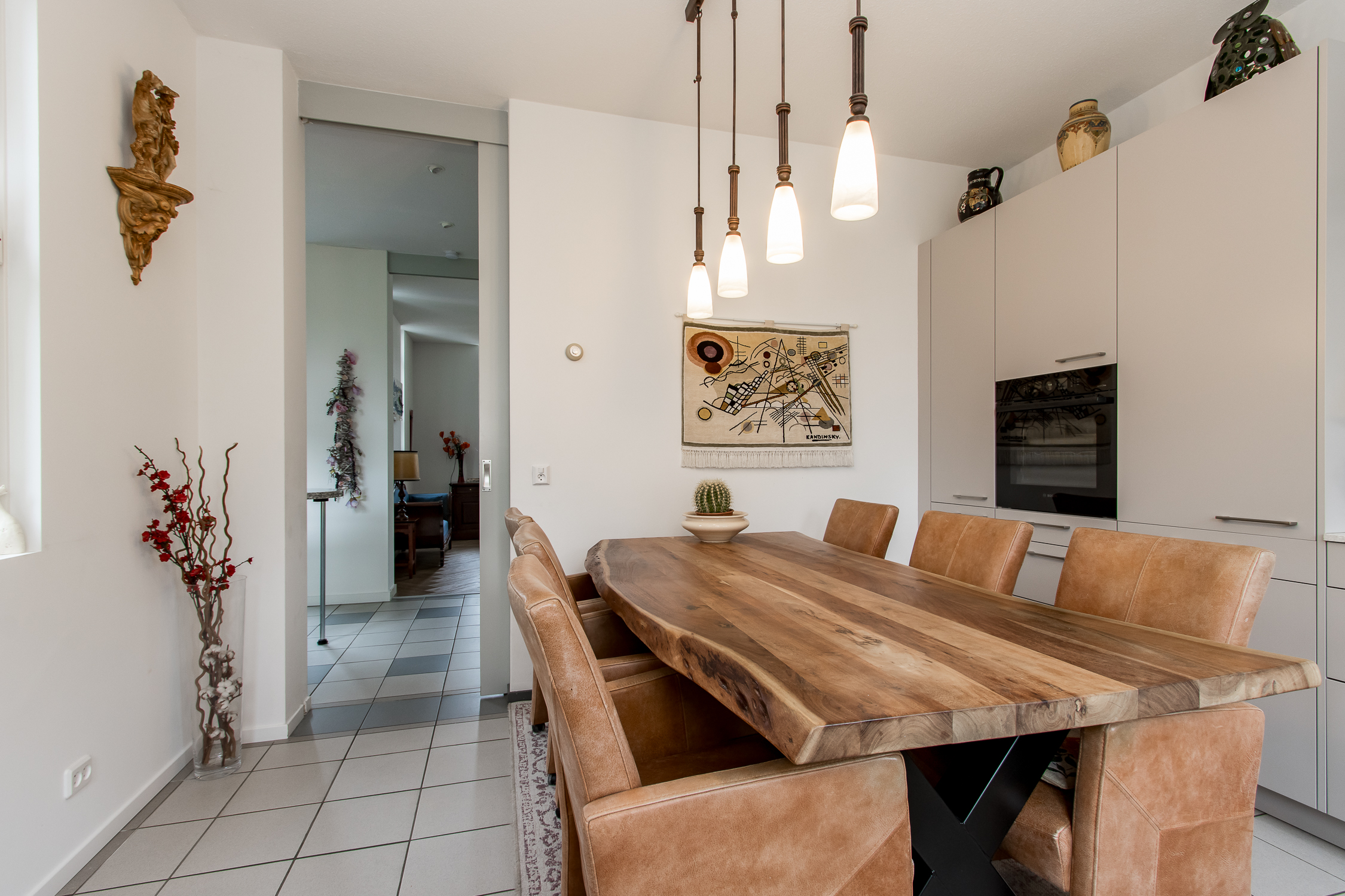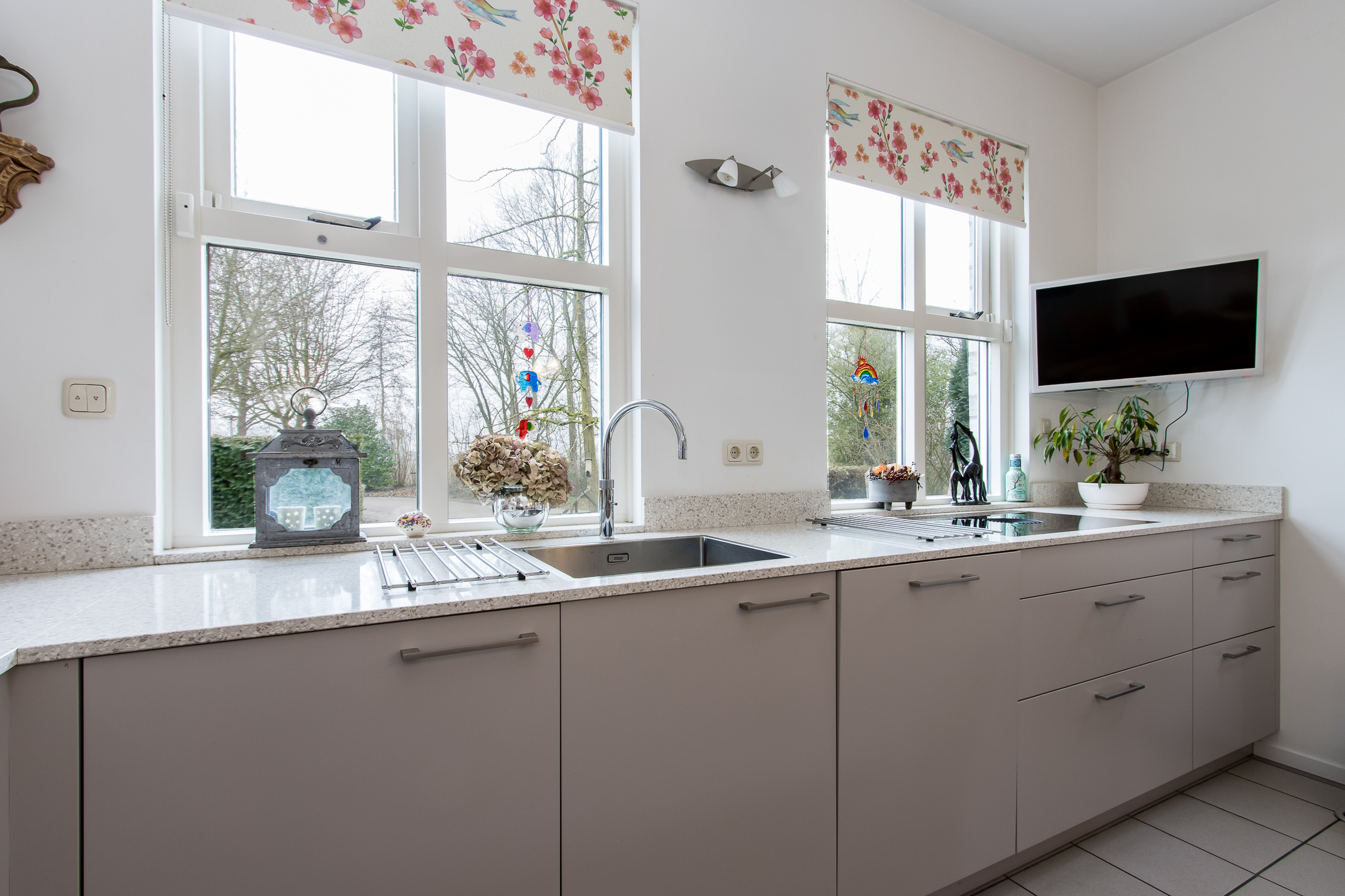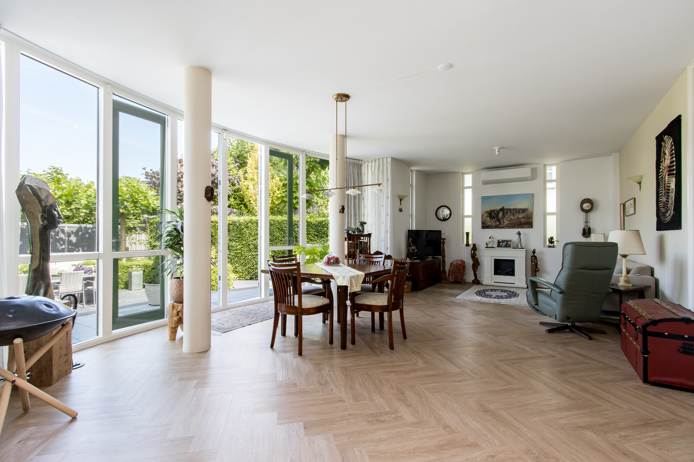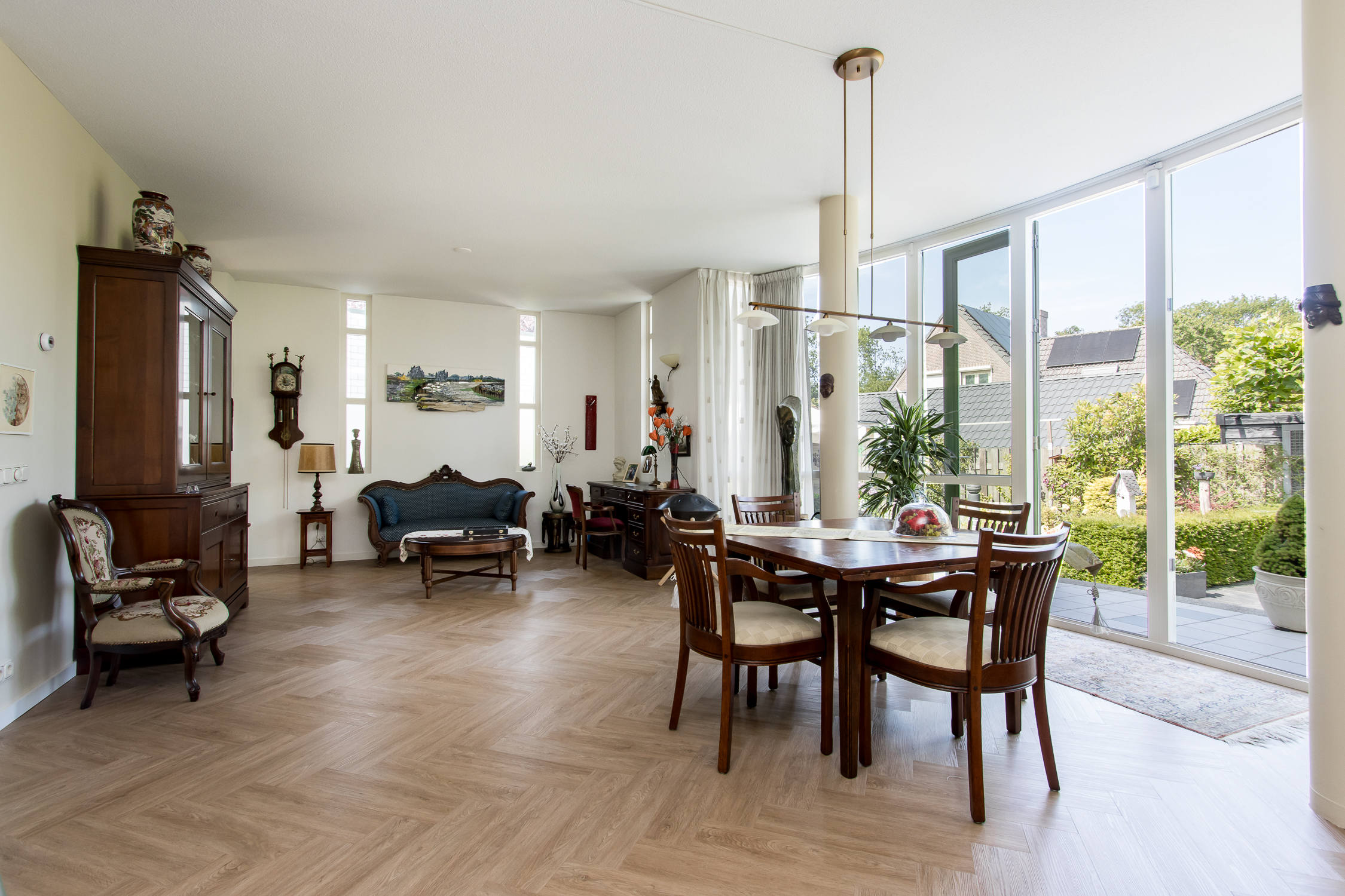 De lichte woonkamer is gelegen aan de achterzijde en biedt een prachtig uitzicht op de fraai aangelegde achtertuin. De woonkamer beschikt over een airco tevens verwarmingsunit van 2023. In voor-en najaar kan hiermee de kamer verwarmd worden maar ook in de winter als bijverwarming voldoet deze unit. Uiteraard kan de kamer ook goed gekoeld worden. Vanuit de woonkamer komt u via de bijkeuken met een tweede elektrische kookplaat en vaatwasser in de compleet ingerichte woonkeuken met vrij uitzicht. De keuken in hoekopstelling is uitgerust met diverse inbouwapparatuur zoals een Bora inductiekookplaat met geïntegreerde afzuiging, (stoom)oven, koelkast, vaatwasser en Quooker.