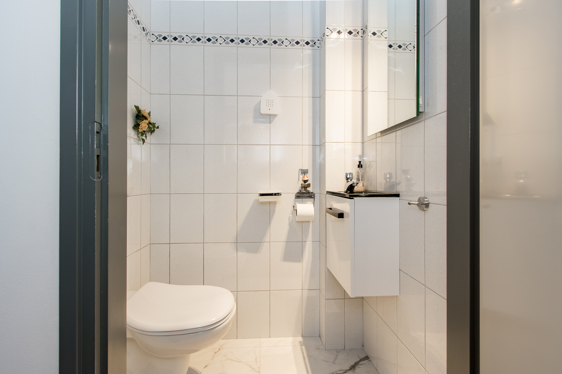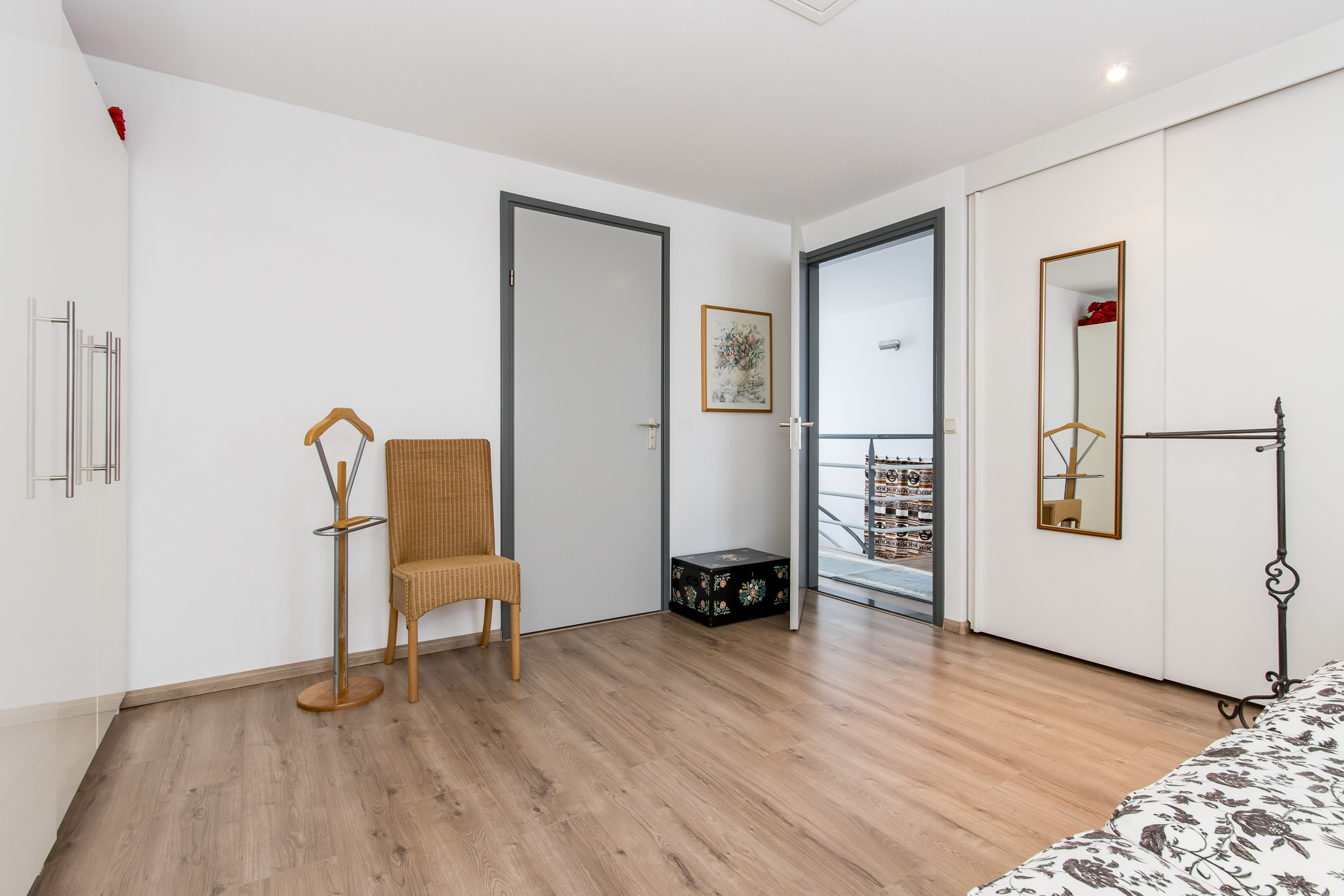 Eerste verdieping: de ruime overloop biedt toegang tot twee royale slaapkamers, elk met een eigen badkamer voorzien van een douche en wastafel. Daarnaast bevindt zich op de overloop een separaat toilet en een bergkast waarin zich ook de elektrische boiler bevindt. De voorzijde is uitgerust met een balkon en aan de achterzijde leiden openslaande deuren naar het riante dakterras.