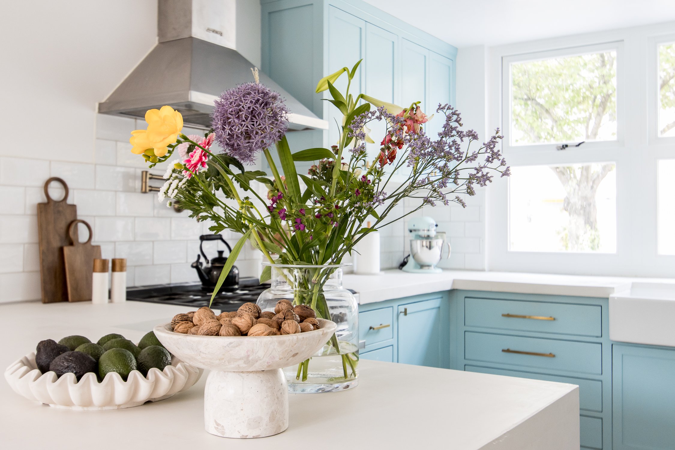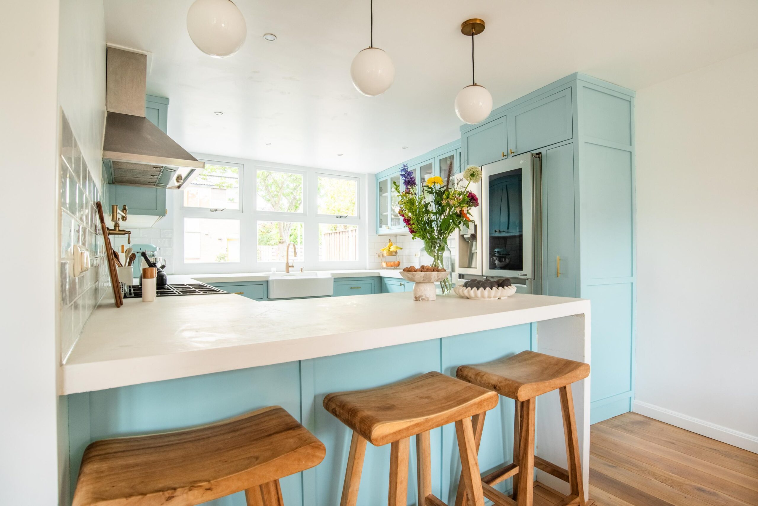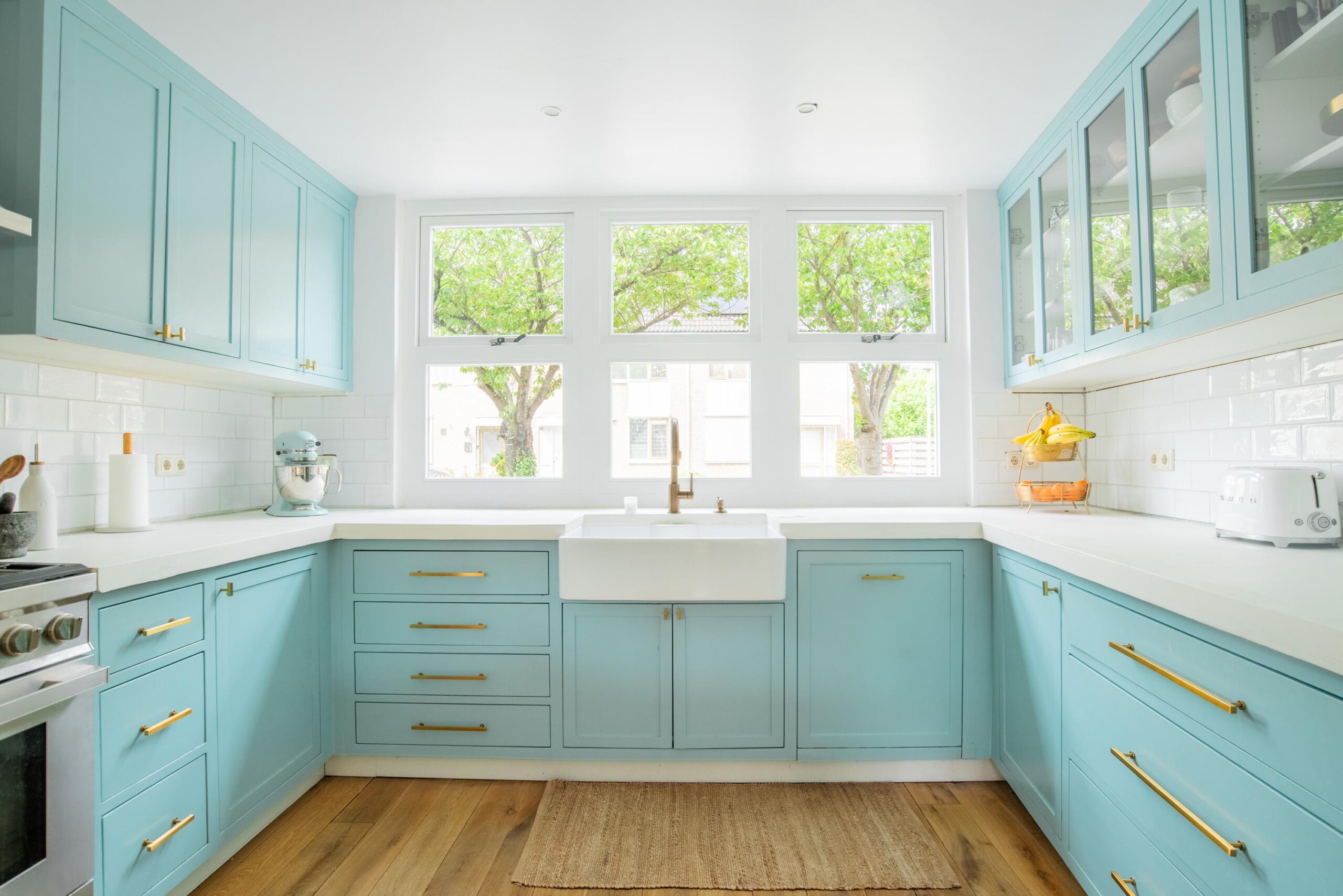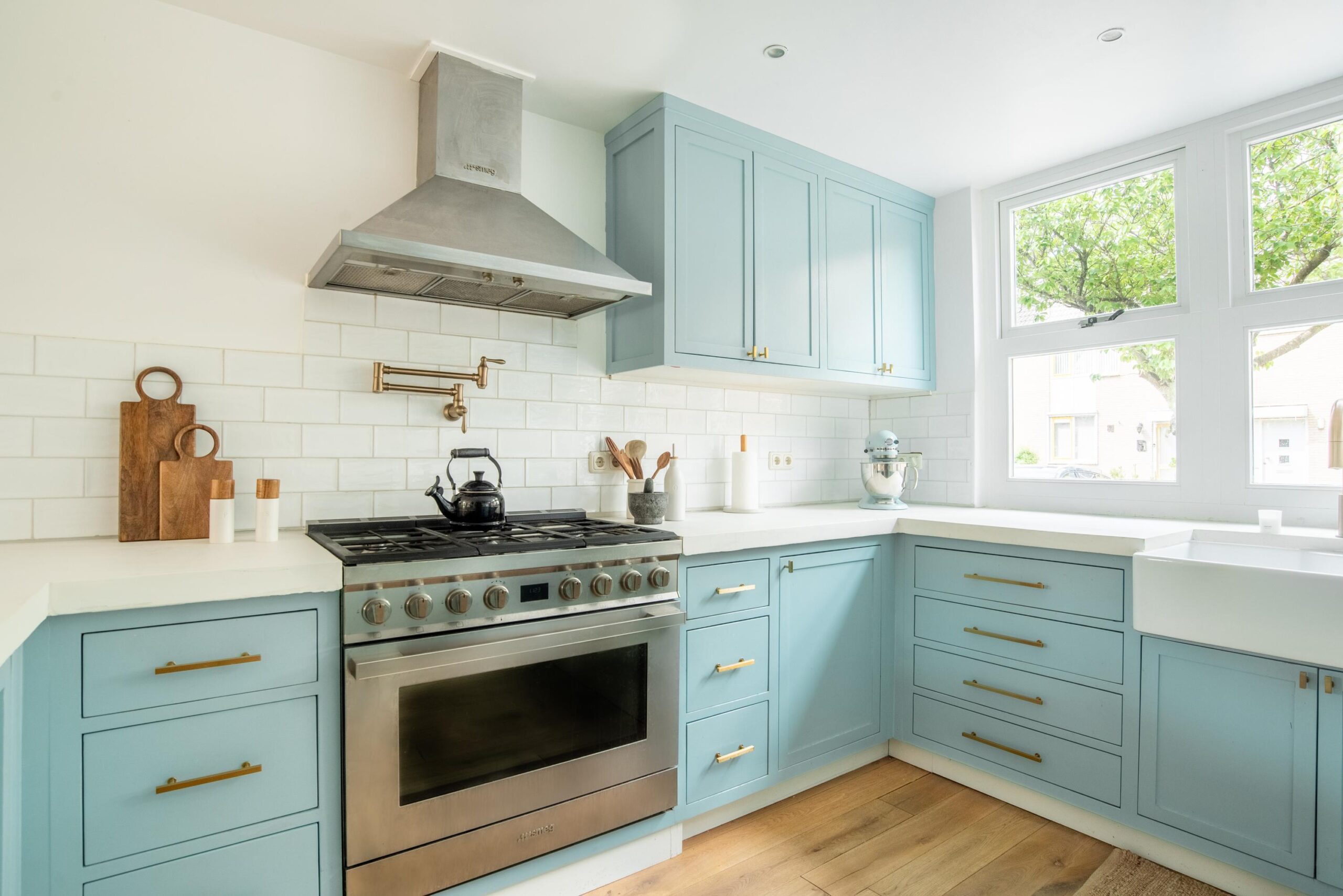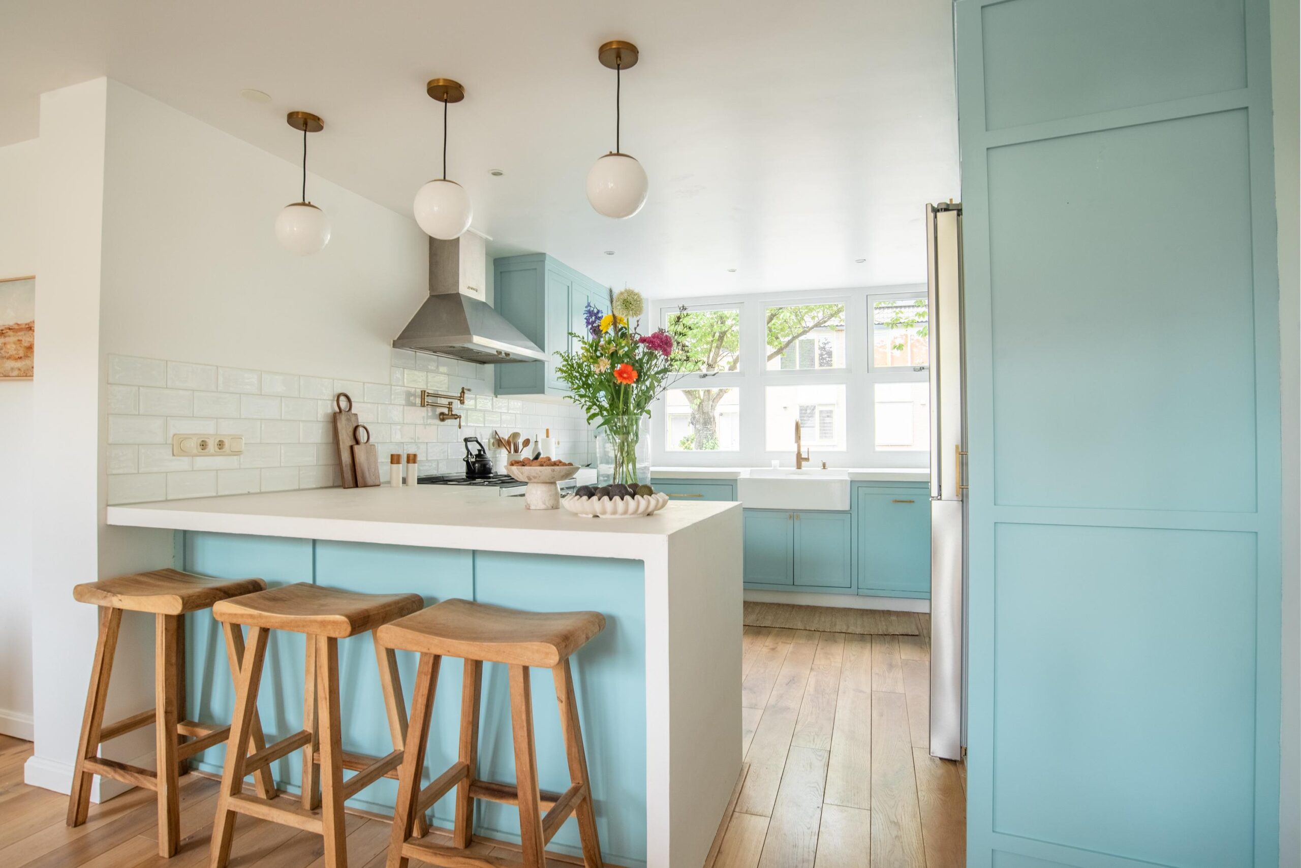 • ruime, lichte keuken in U-opstelling met ontbijtbar en inbouwapparatuur;