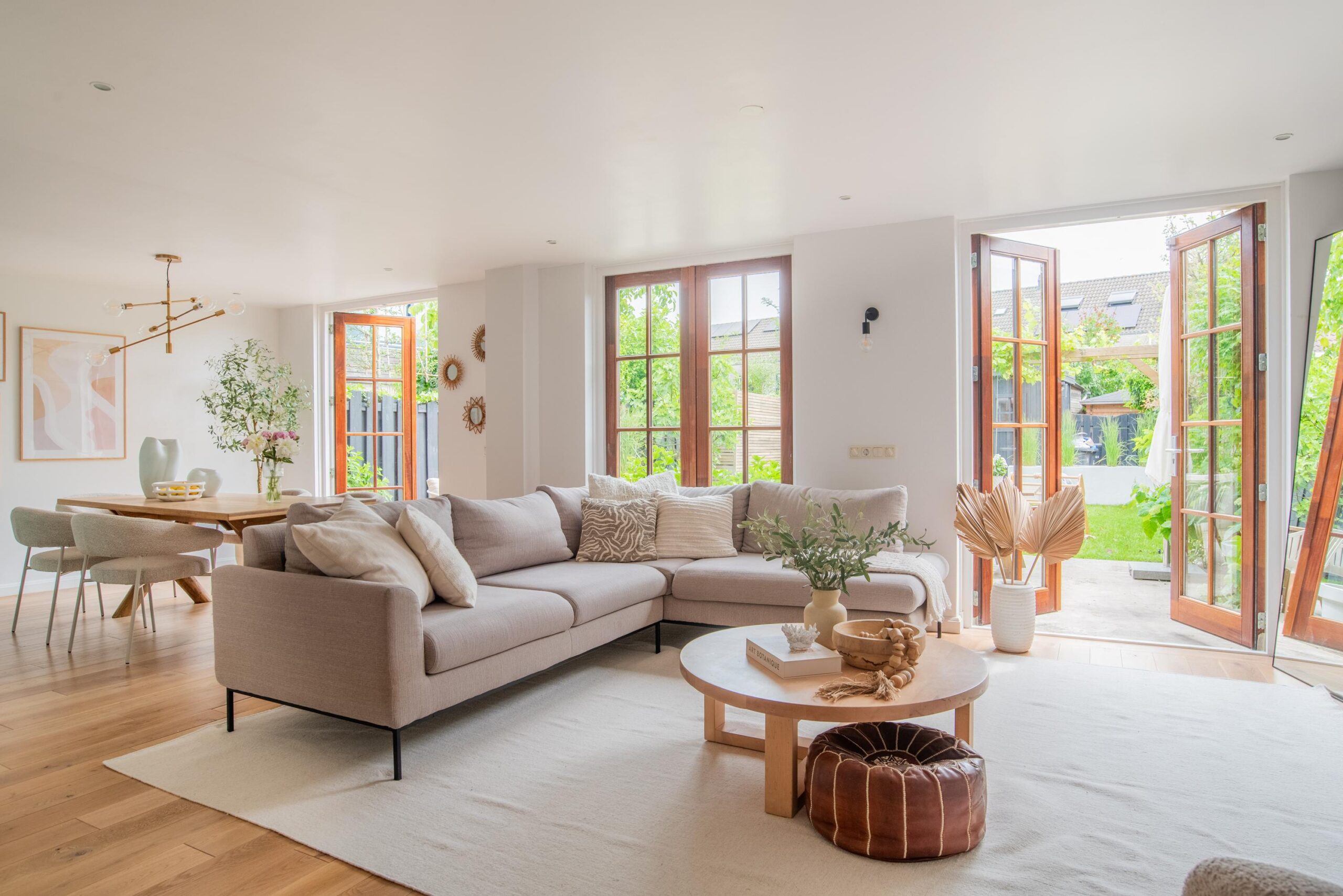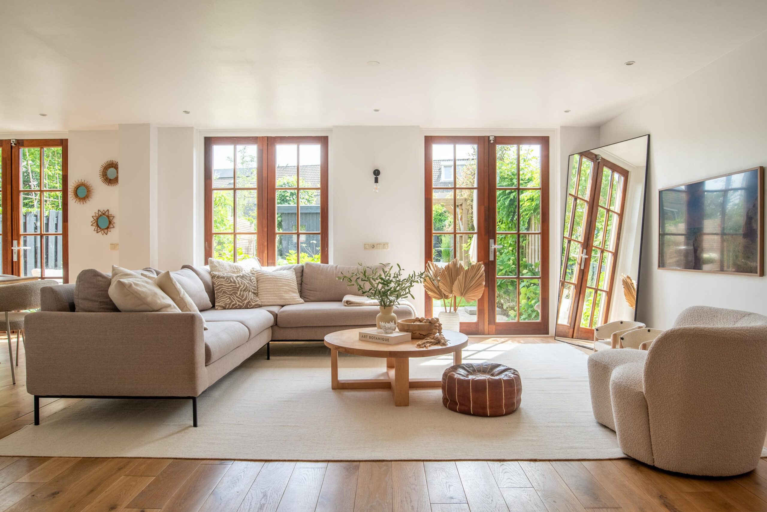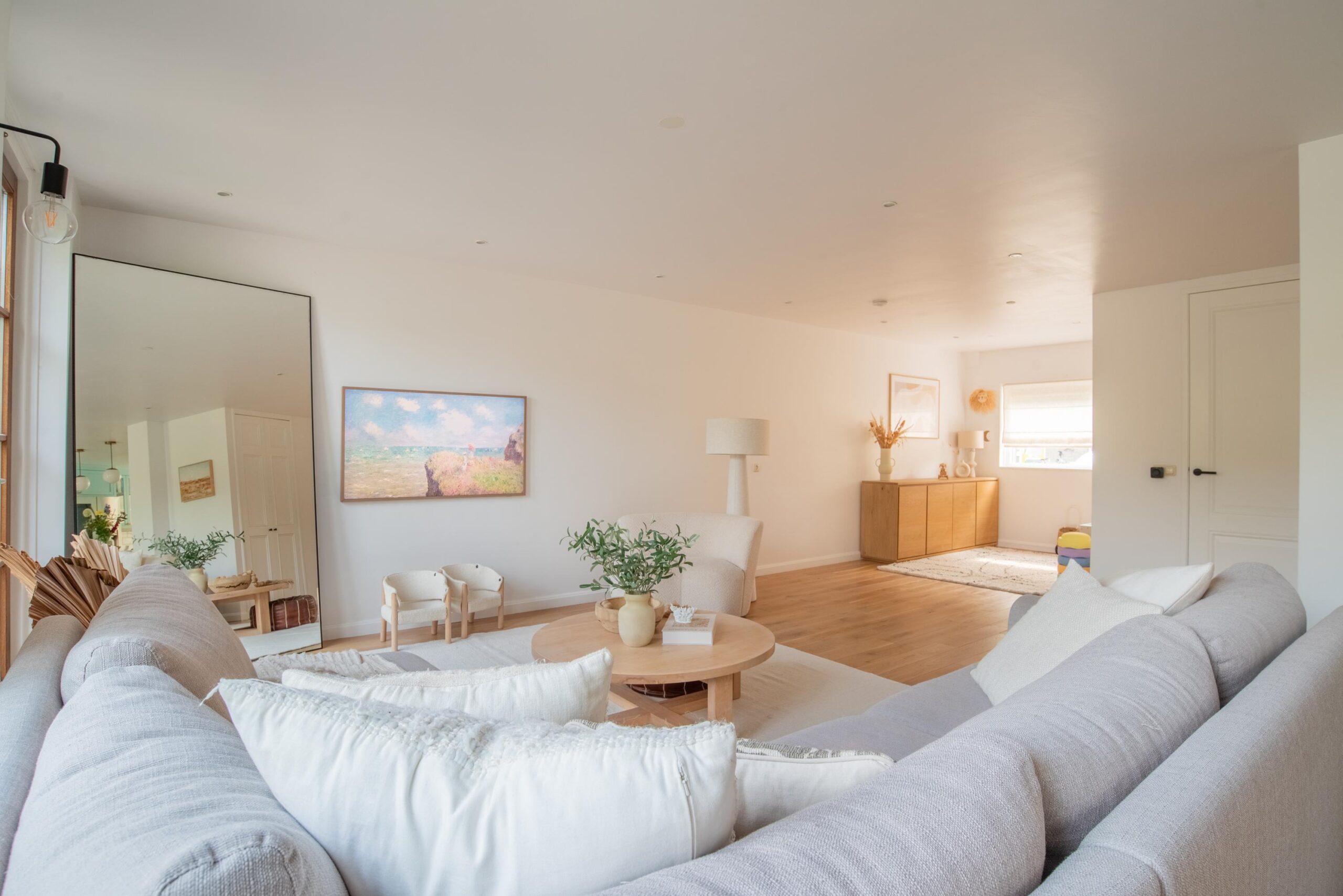 De woonkamer is royaal en baadt in het daglicht, mede dankzij de drie dubbele openslaande tuindeuren die de verzorgde achtertuin op een natuurlijke manier bij de leefruimte betrekken. De open keuken en ruime indeling maken dit huis uitermate geschikt voor gezinnen of mensen die graag de ruimte hebben. Met maar liefst vijf volwaardige slaapkamers is er plek genoeg voor werken, slapen en ontspannen. Buiten is het ook goed toeven: de woning beschikt over een eigen oprit en een zonnige, fraai aangelegde achtertuin met volop privacy.