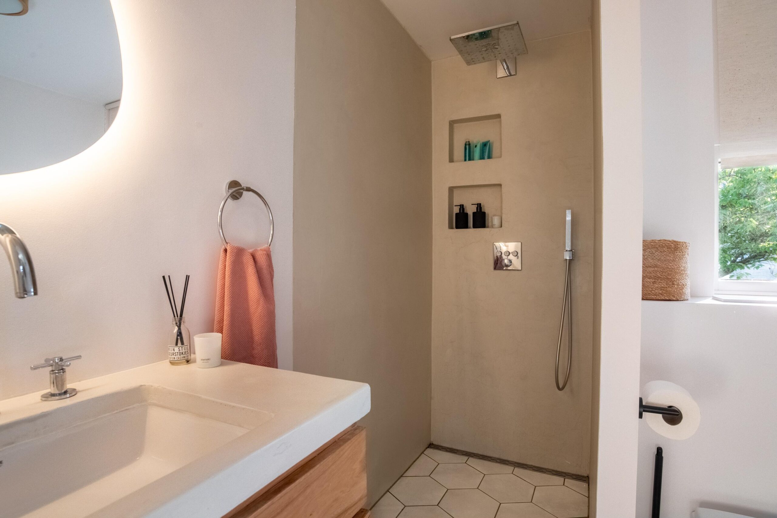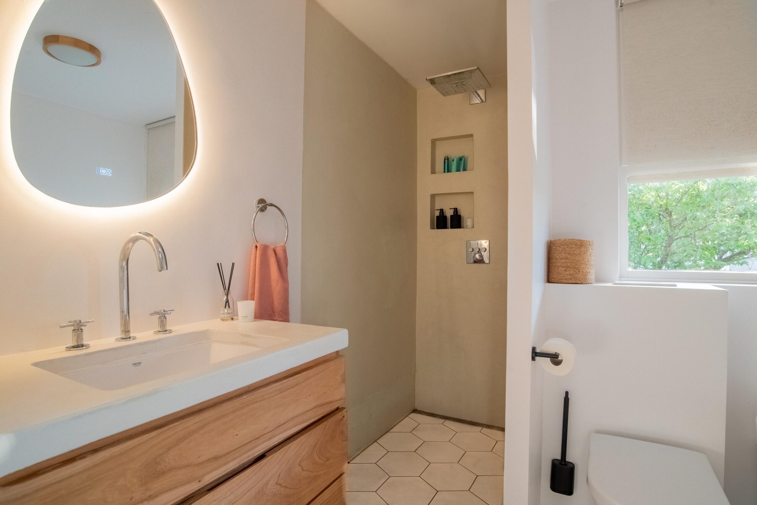 Eerste verdieping: de overloop biedt toegang tot drie goed bemeten slaapkamers en de moderne badkamer. Deze is ingericht met een ligbad, een ruime inloopdouche, een wandcloset en een stijlvol badkamermeubel met wastafel.