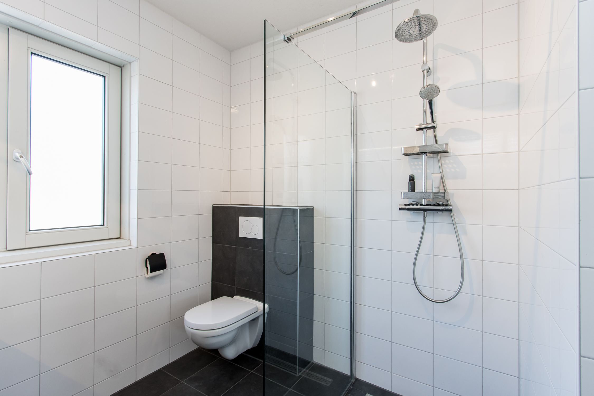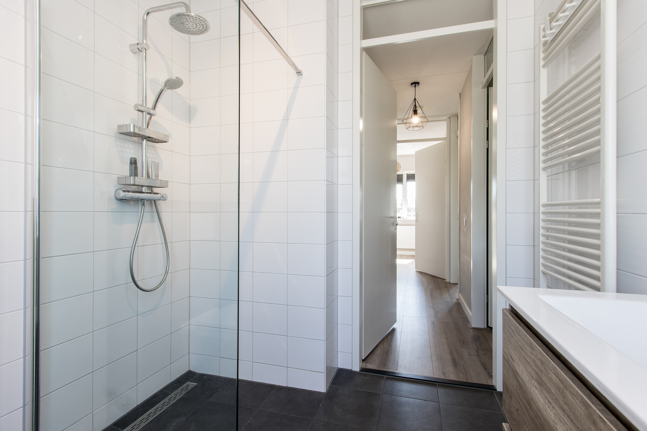Eerste verdieping: de overloop leidt naar drie slaapkamers en moderne badkamer met inloopdouche, wastafelmeubel, wandcloset en designradiator.