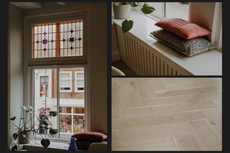 • split-level woonkamer met visgraatvloer, originele balken en glas-in-loodramen;