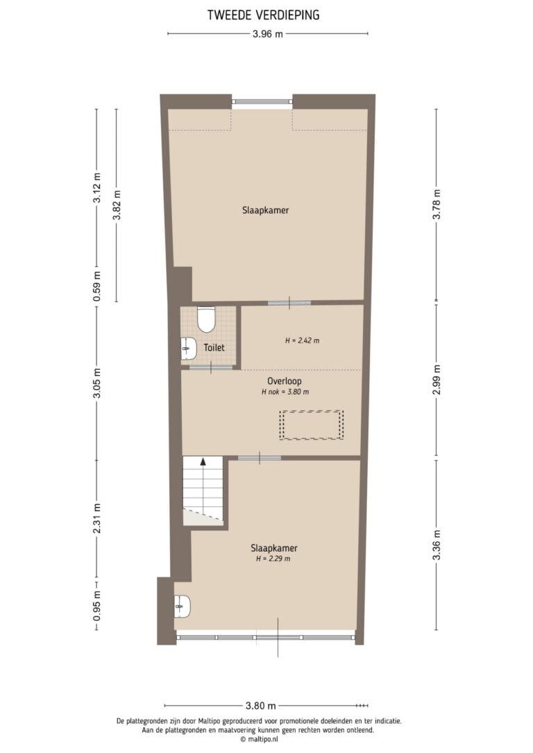Tweede verdieping: op de tweede verdieping vind je een ruime overloop met aparte toiletruimte en twee goed bemeten slaapkamers, waarvan één is voorzien van een wastafel.