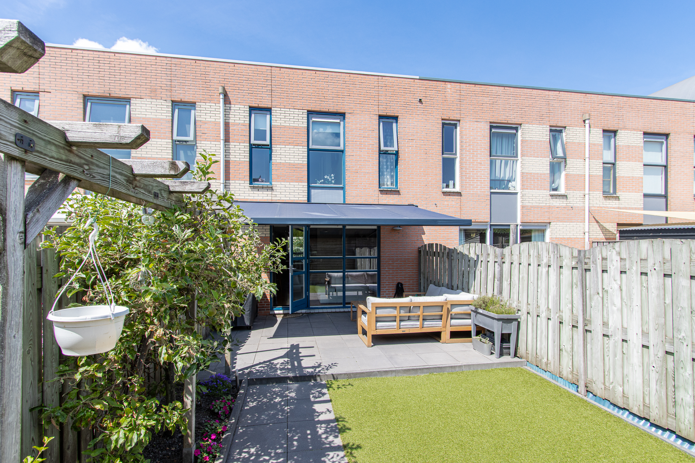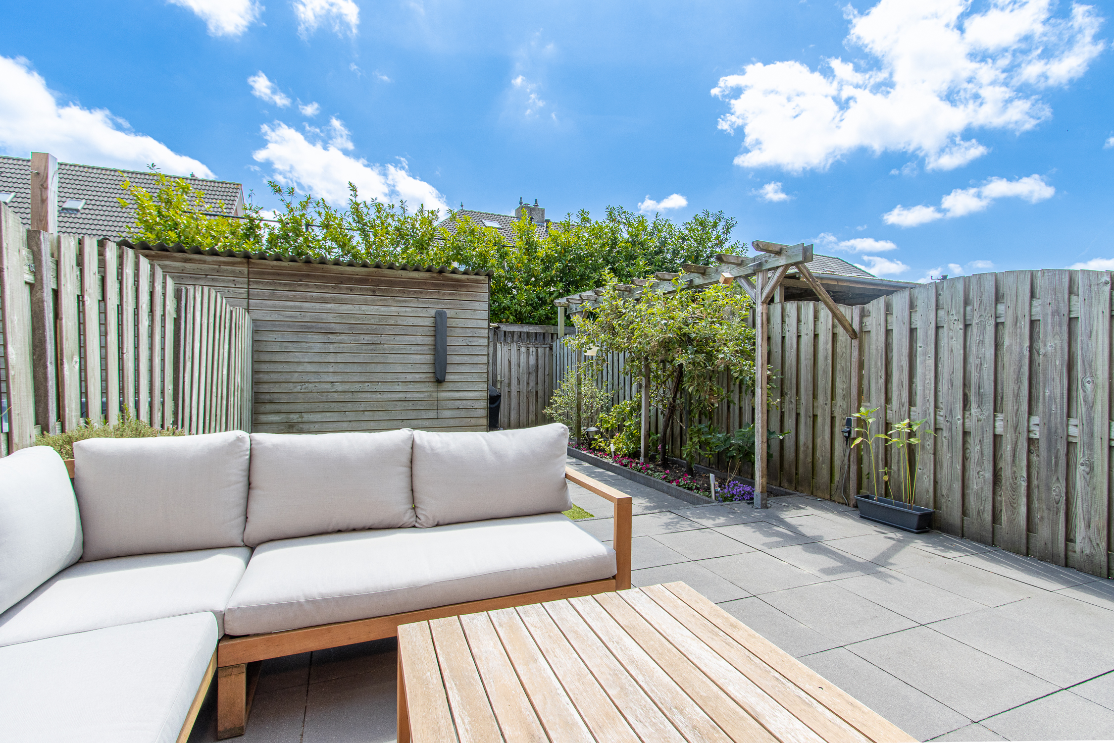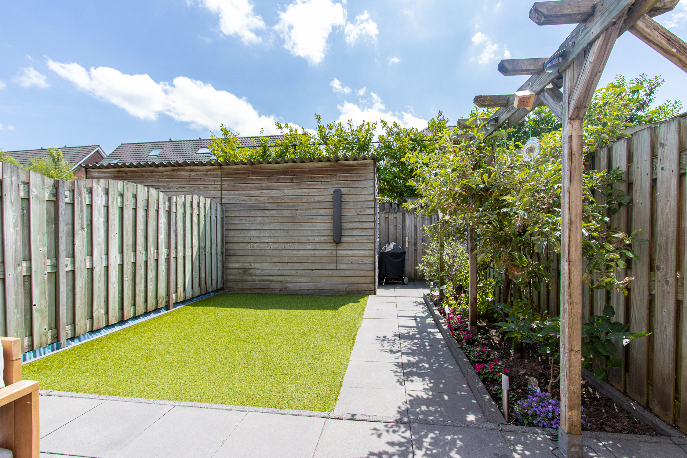 Aan de achterzijde bevindt zich de verzorgde tuin met zonnige ligging op het zuiden. De tuin is sfeervol ingericht met moderne terrastegels, plantenborders, kunstgras, een vrijstaande houten berging en heeft een achterom.