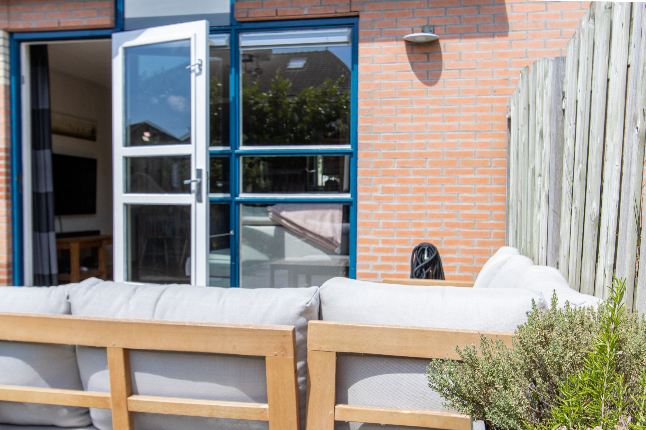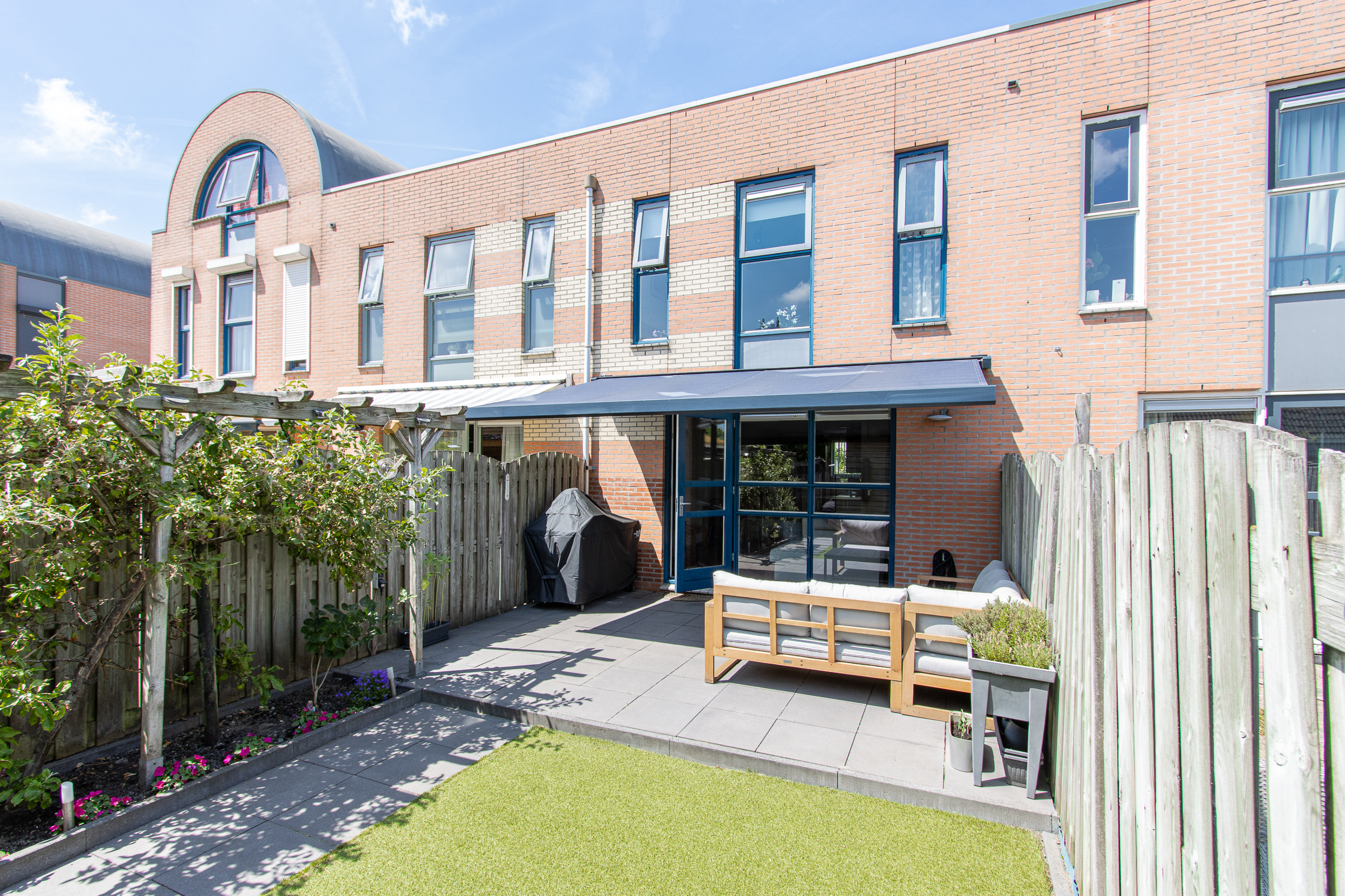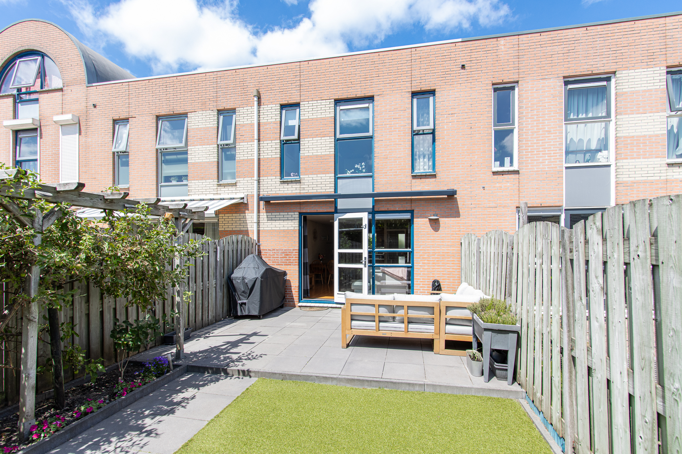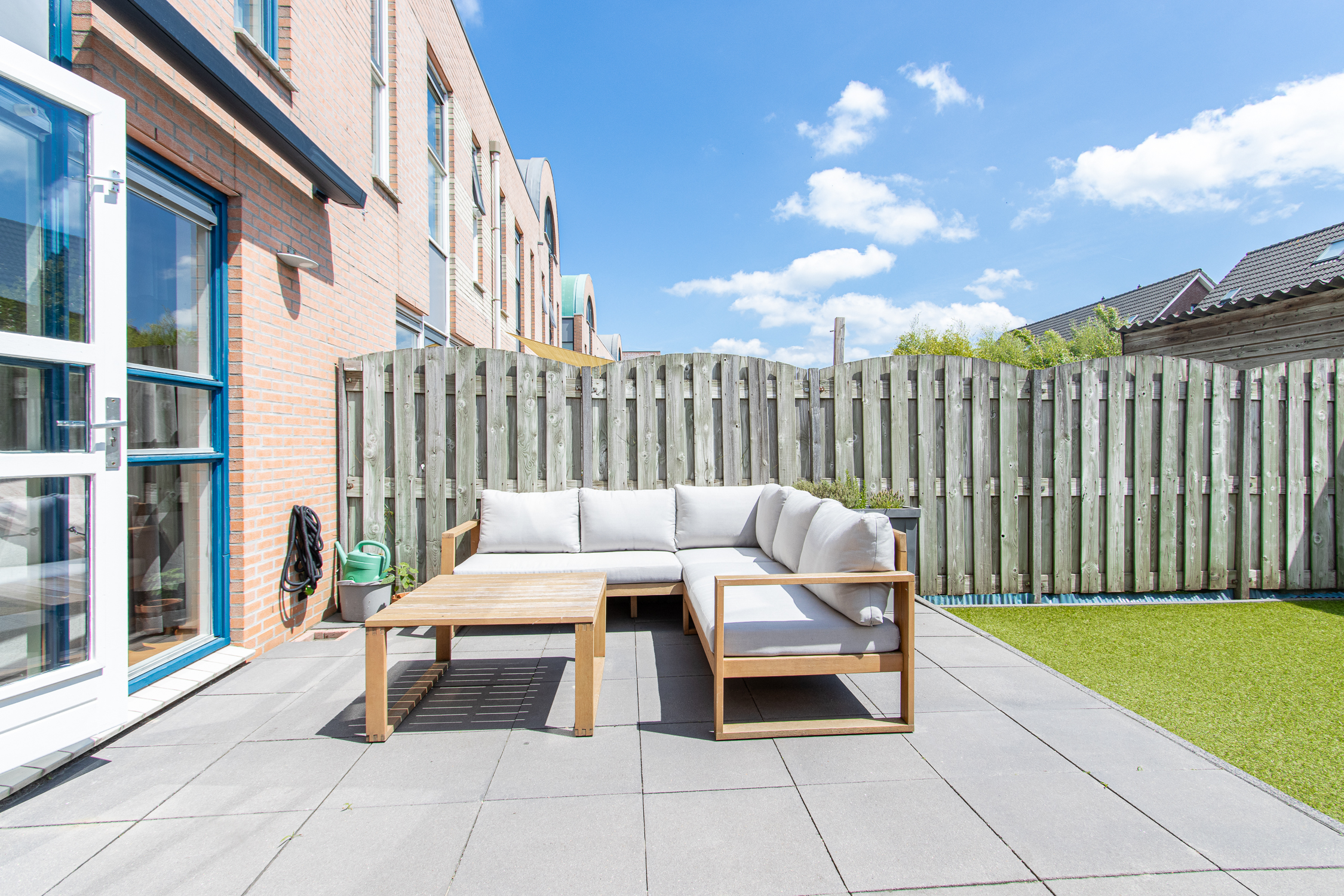 Aan de achterzijde bevindt zich de verzorgde tuin met zonnige ligging op het zuiden. De tuin is sfeervol ingericht met moderne terrastegels, plantenborders, kunstgras, een vrijstaande houten berging en heeft een achterom.