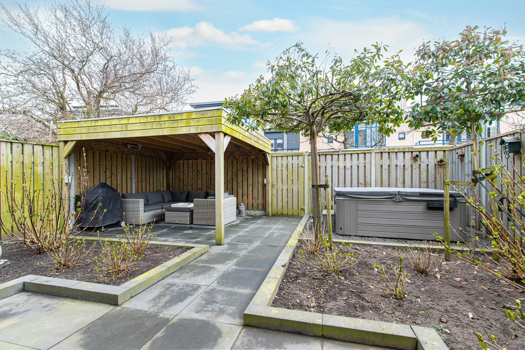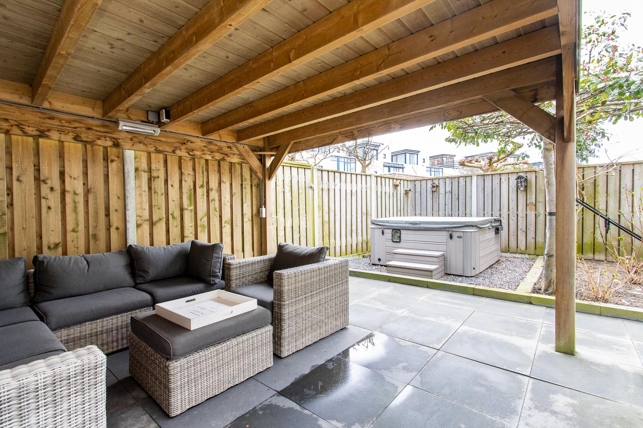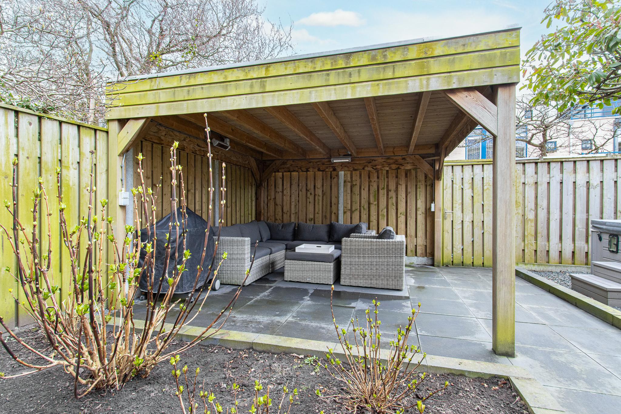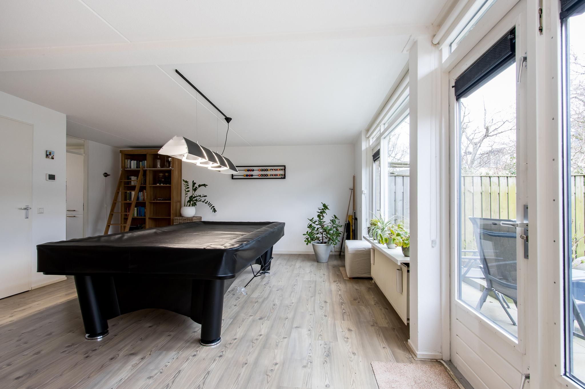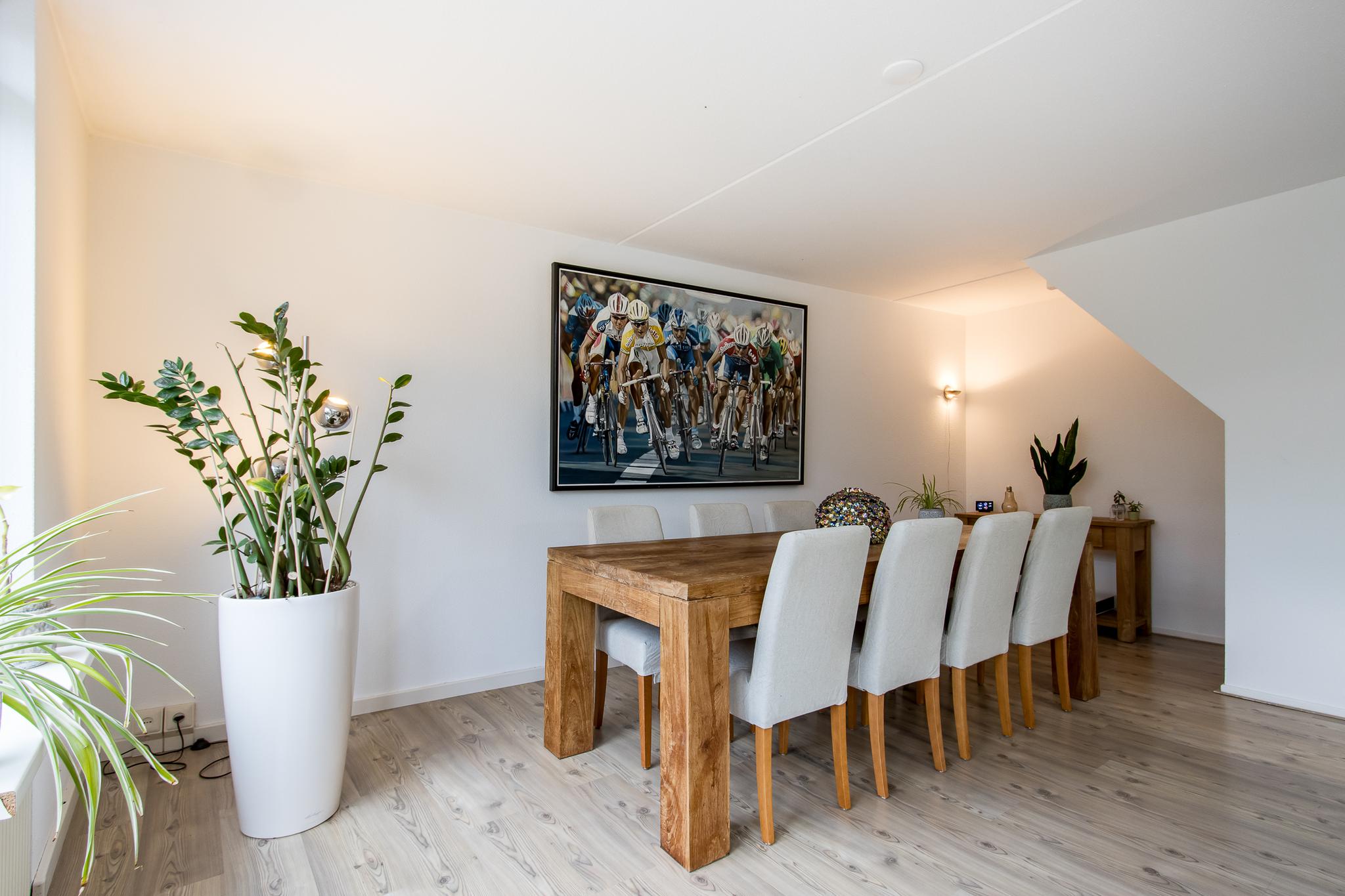 De lichte en ruime woonkamer vormt het hart van de woning. Dankzij de grote raampartijen en de openslaande deuren naar de fraai aangelegde achtertuin met sfeervolle overkapping geniet je hier volop van het daglicht en het buitenleven.