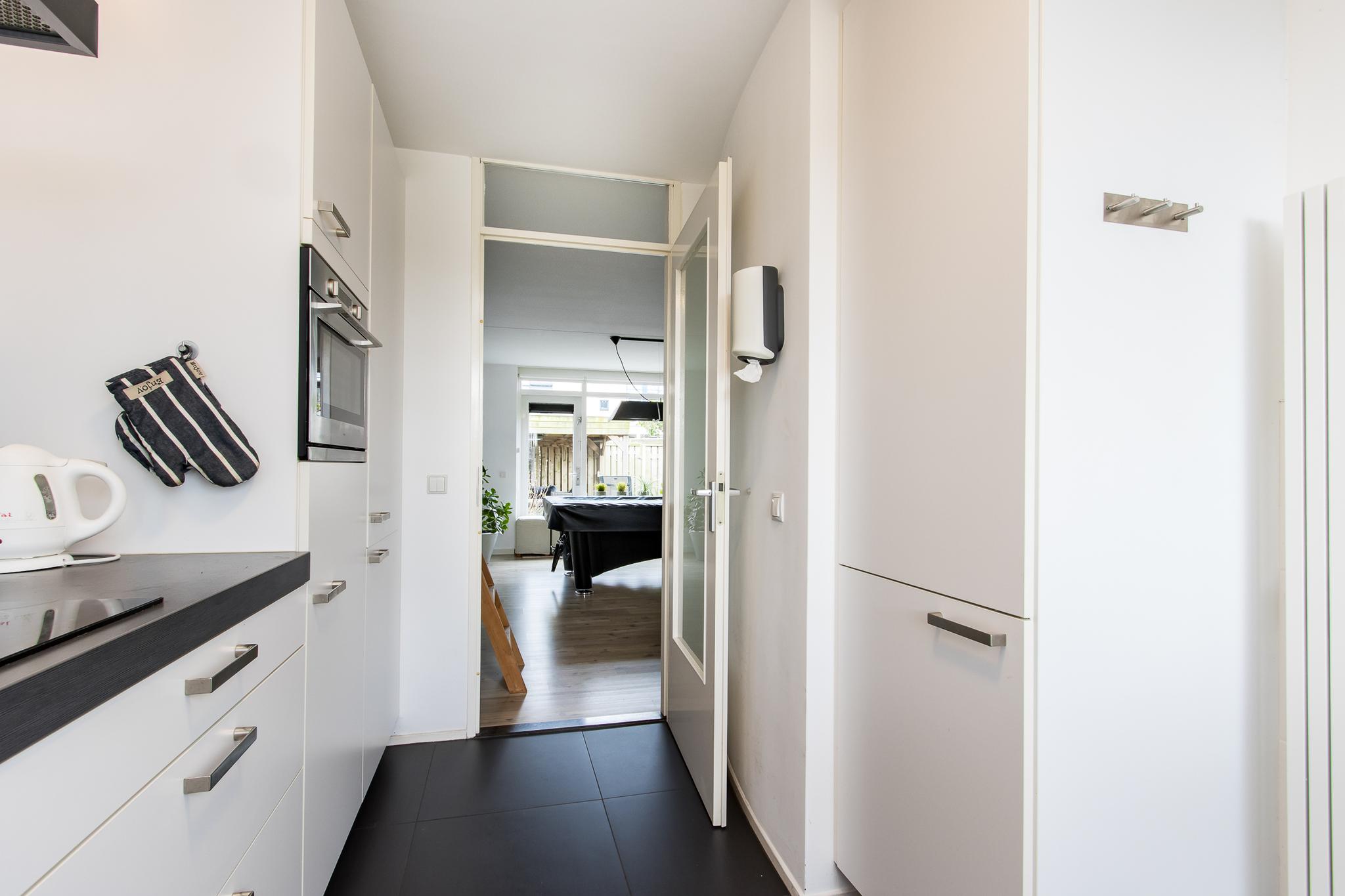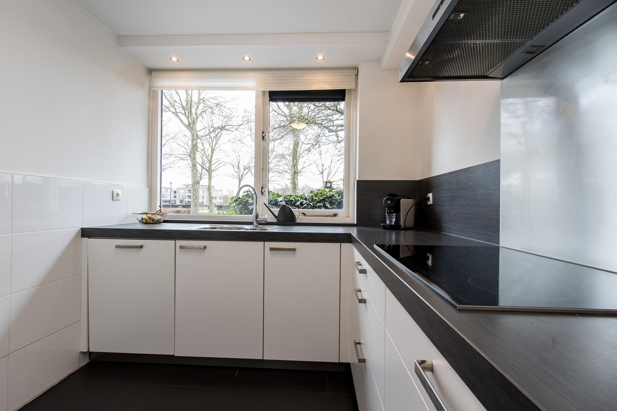 Aan de voorzijde van de woning bevindt zich de moderne keuken, die is uitgerust met een L-vormig keukenblok en diverse inbouwapparatuur, waaronder een inductiekookplaat, afzuigkap, dubbele spoelbak, combi-oven, koel-vriescombinatie en vaatwasser.