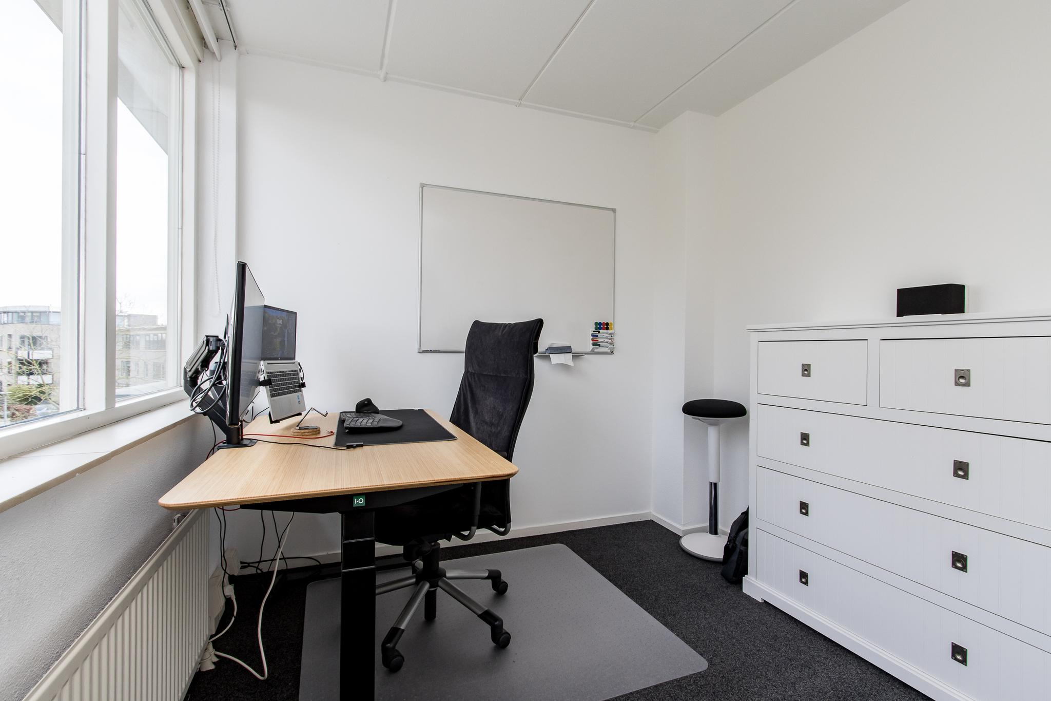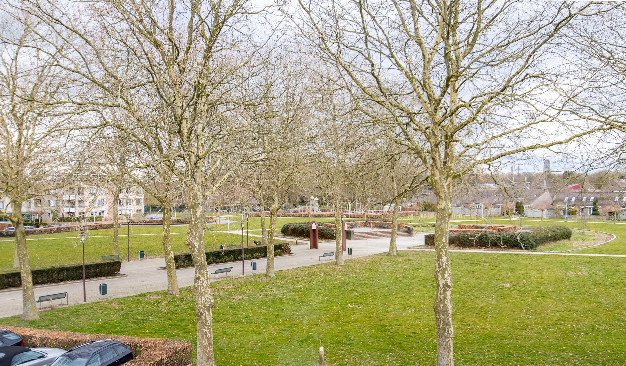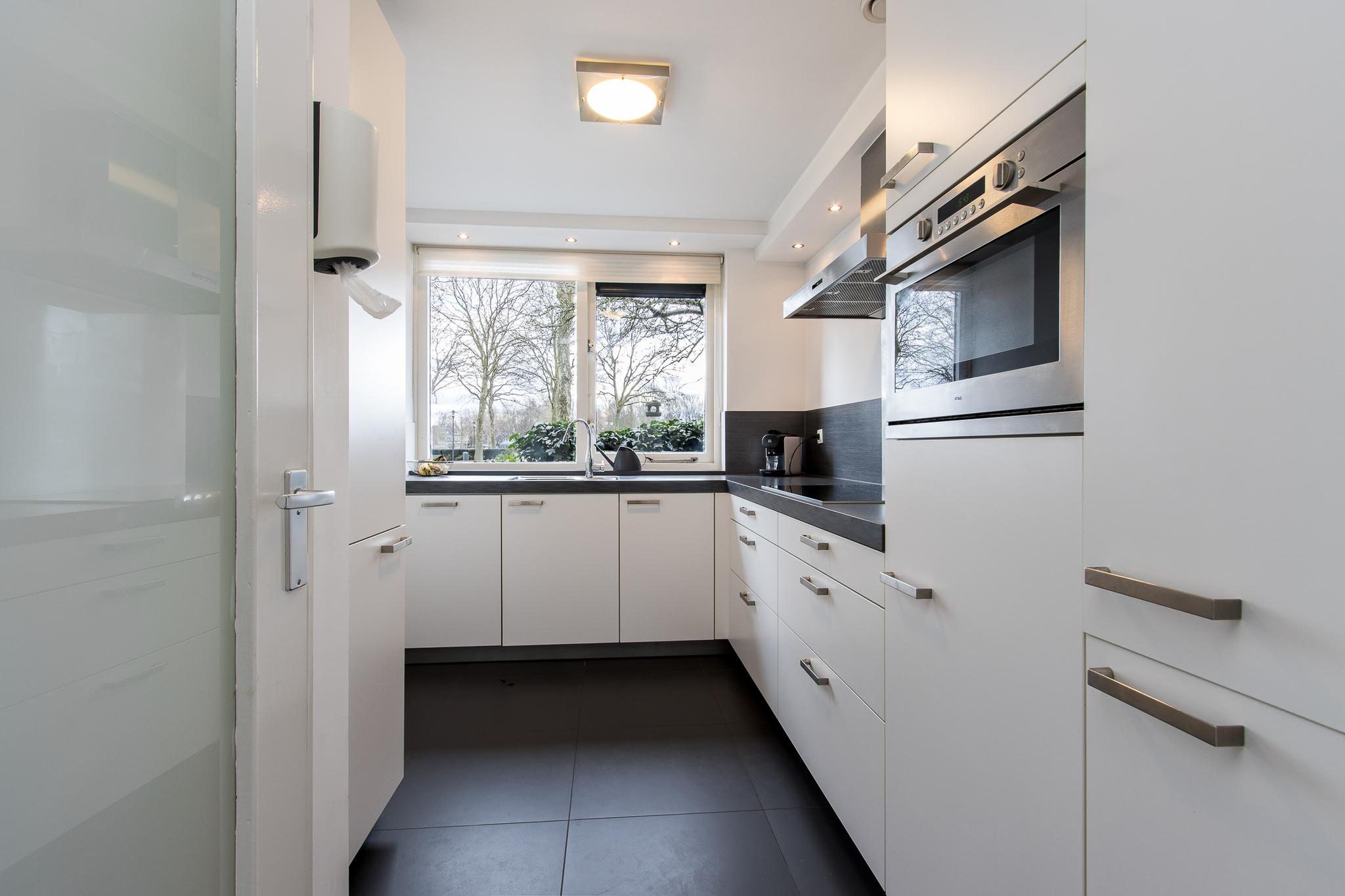 Aan de voorzijde biedt de moderne dichte keuken een vrij uitzicht op de autoluwe straat en het groene Esplanadepark.