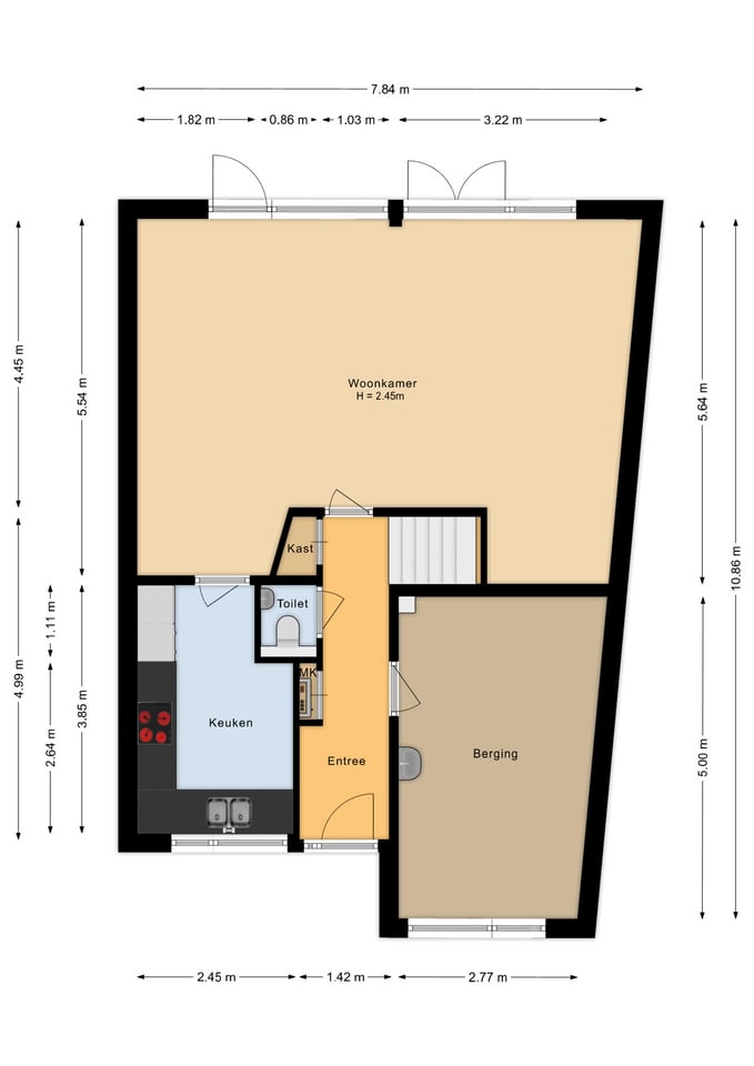 Indeling woning: de entree geeft toegang tot de hal, waar je de toiletruimte, meterkast, garderobe en trapopgang naar de eerste verdieping vindt. Vanuit de hal bereik je tevens de berging. Vervolgens stap je de tuingerichte woonkamer binnen, een fijne en lichte leefruimte met een loopdeur en openslaande tuindeuren naar de achtertuin.