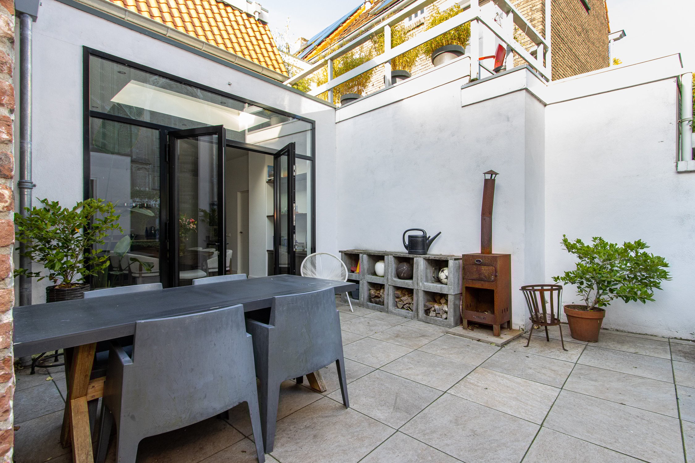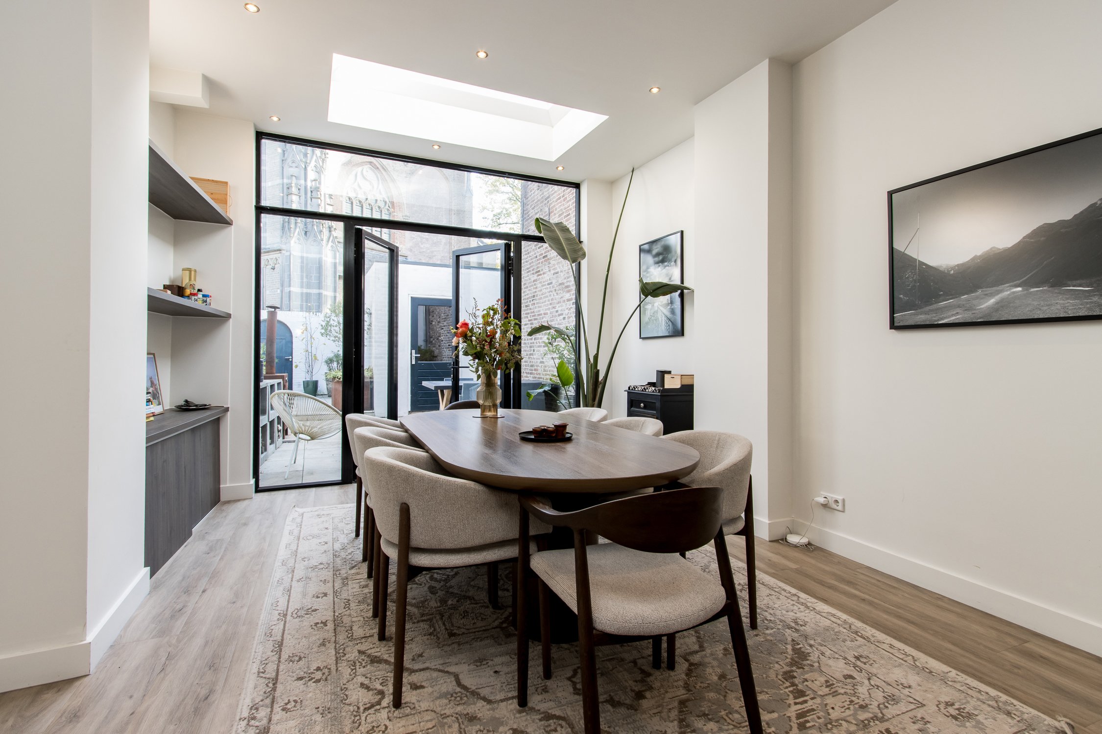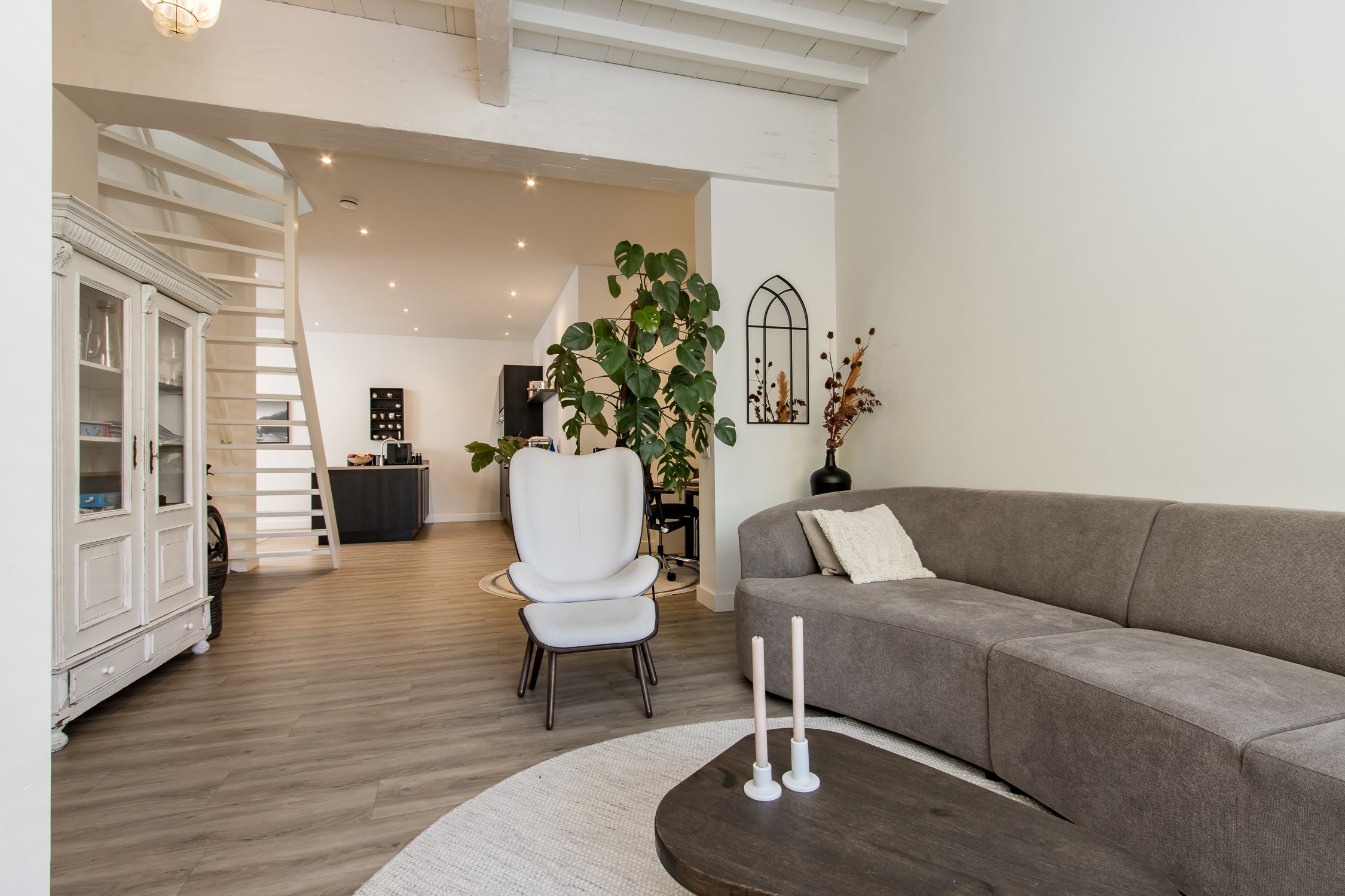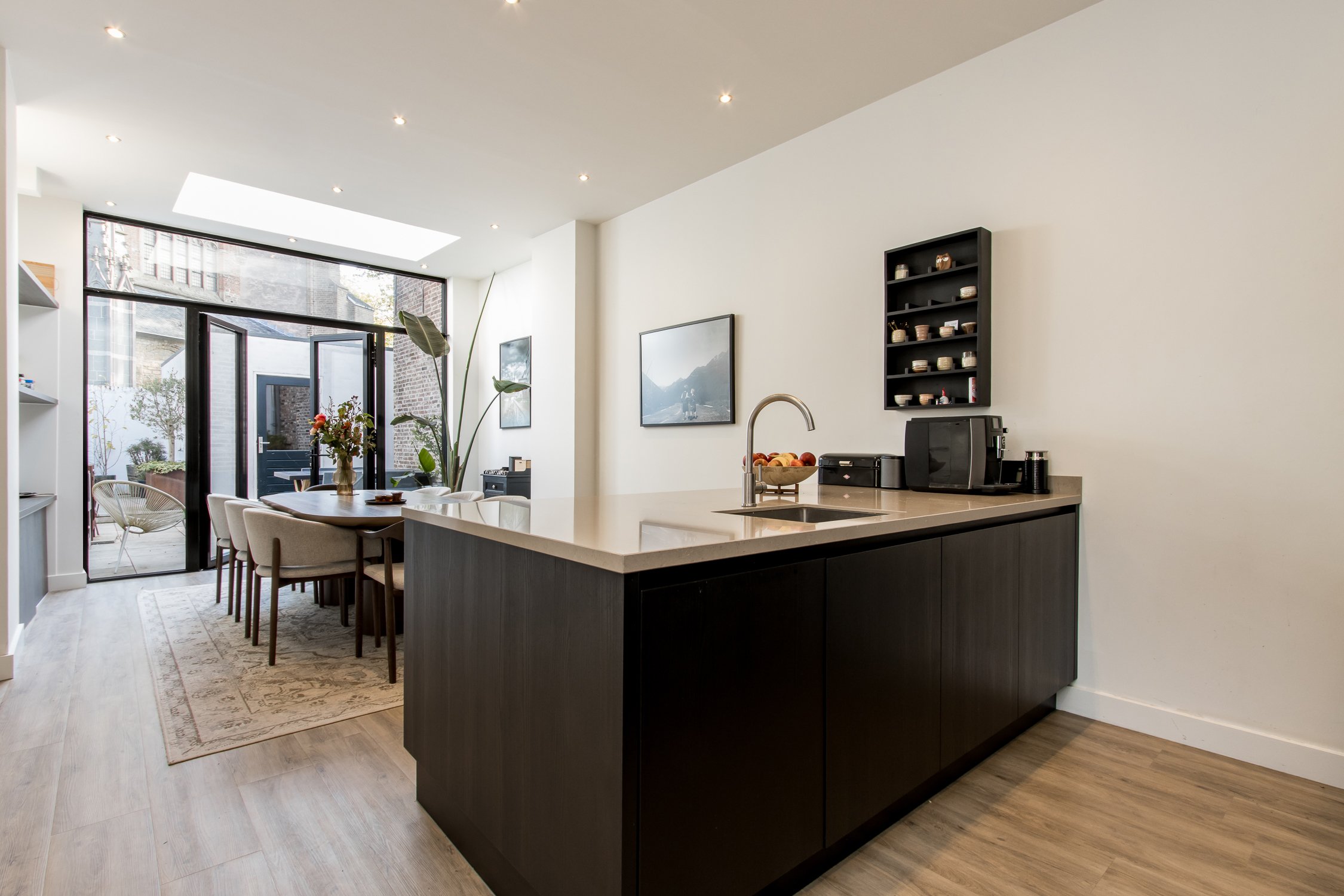De begane grond is recent gerenoveerd en ademt warmte en sfeer. Aan de voorzijde bevindt zich een knusse zithoek met uitzicht op het gezellige straatbeeld. Achterin ligt de moderne woonkeuken, voorzien van een stijlvol spoeleiland en royale eetkamer. Vanuit hier openen de dubbele tuindeuren naar de onderhoudsvriendelijke stadstuin – een sfeervolle plek waar je in alle rust kunt genieten van de middagzon.