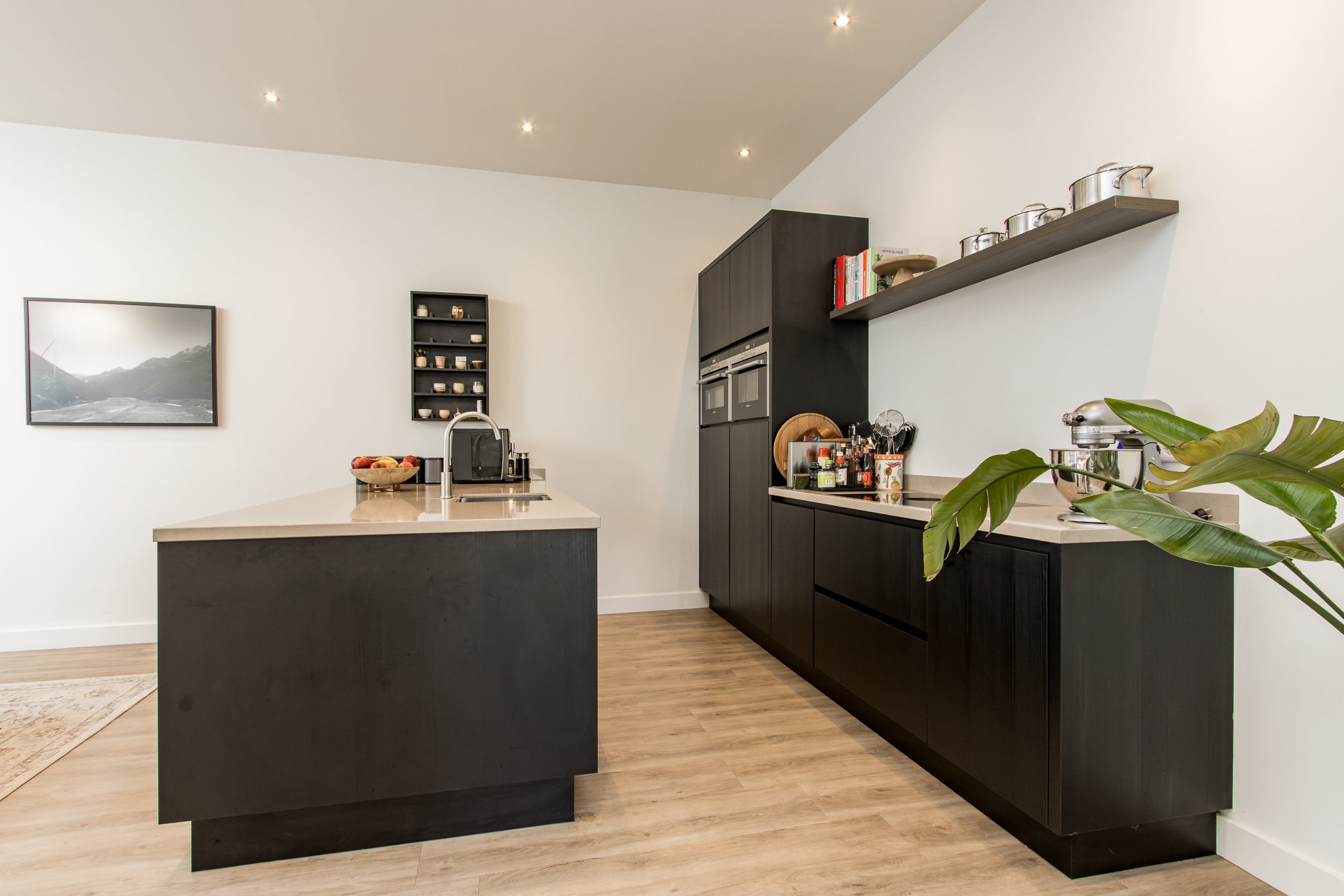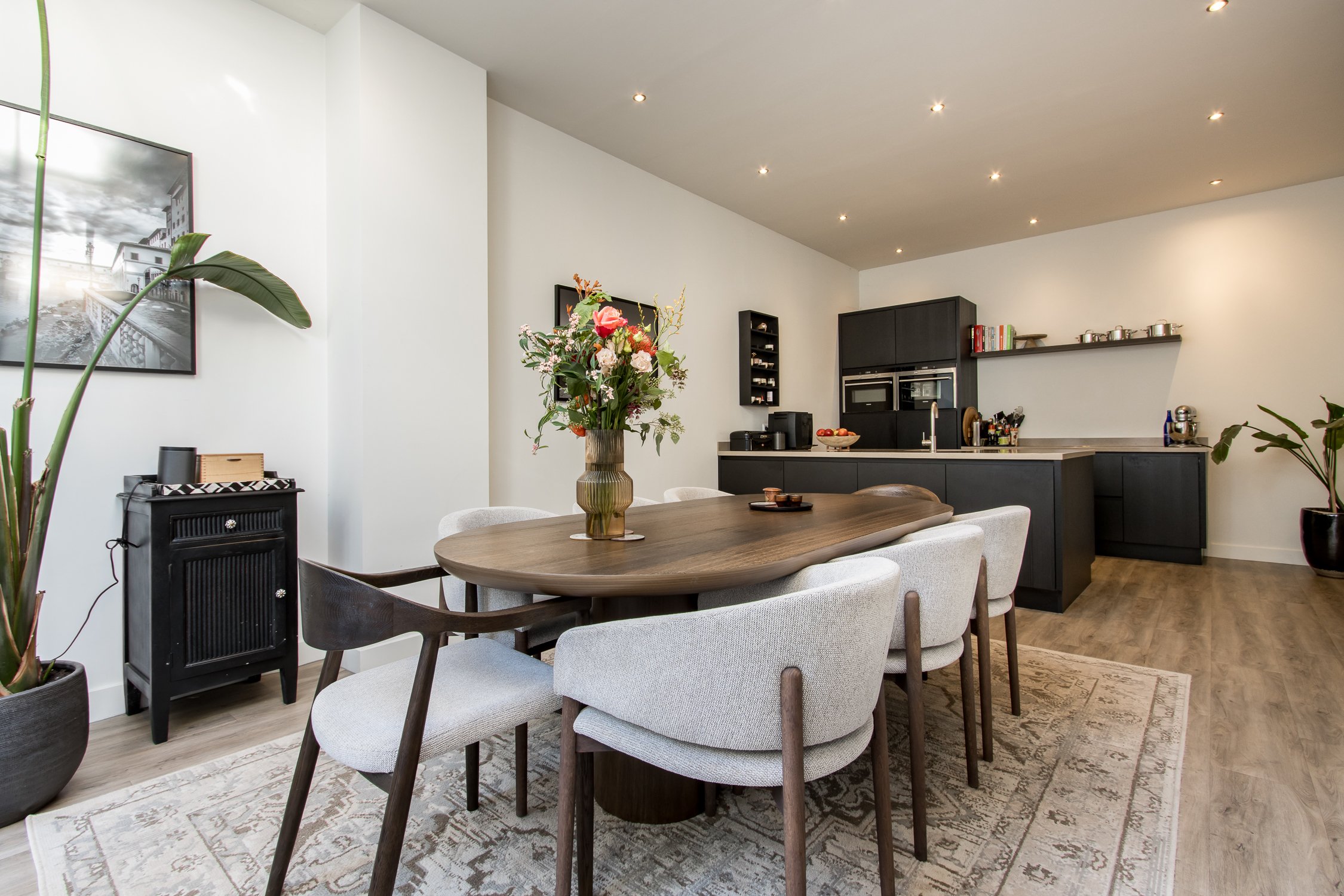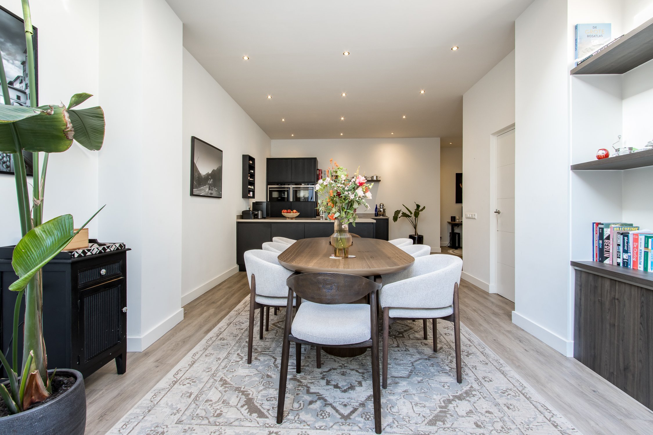• moderne woonkeuken met spoeleiland en ruime eetkamer;