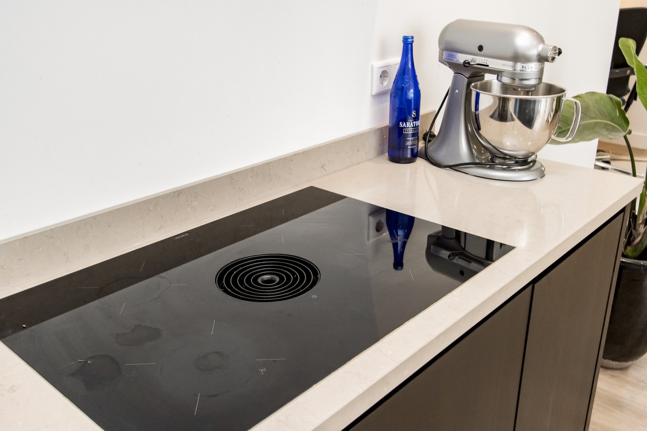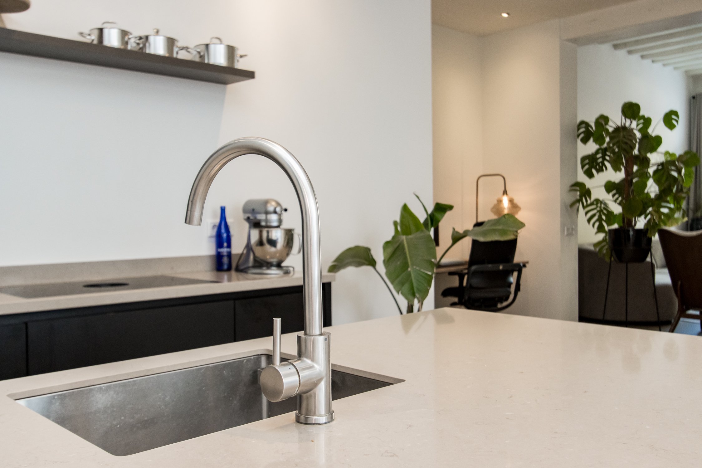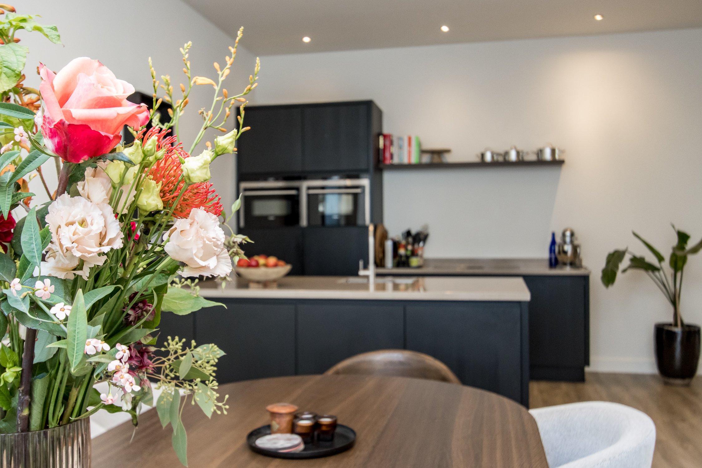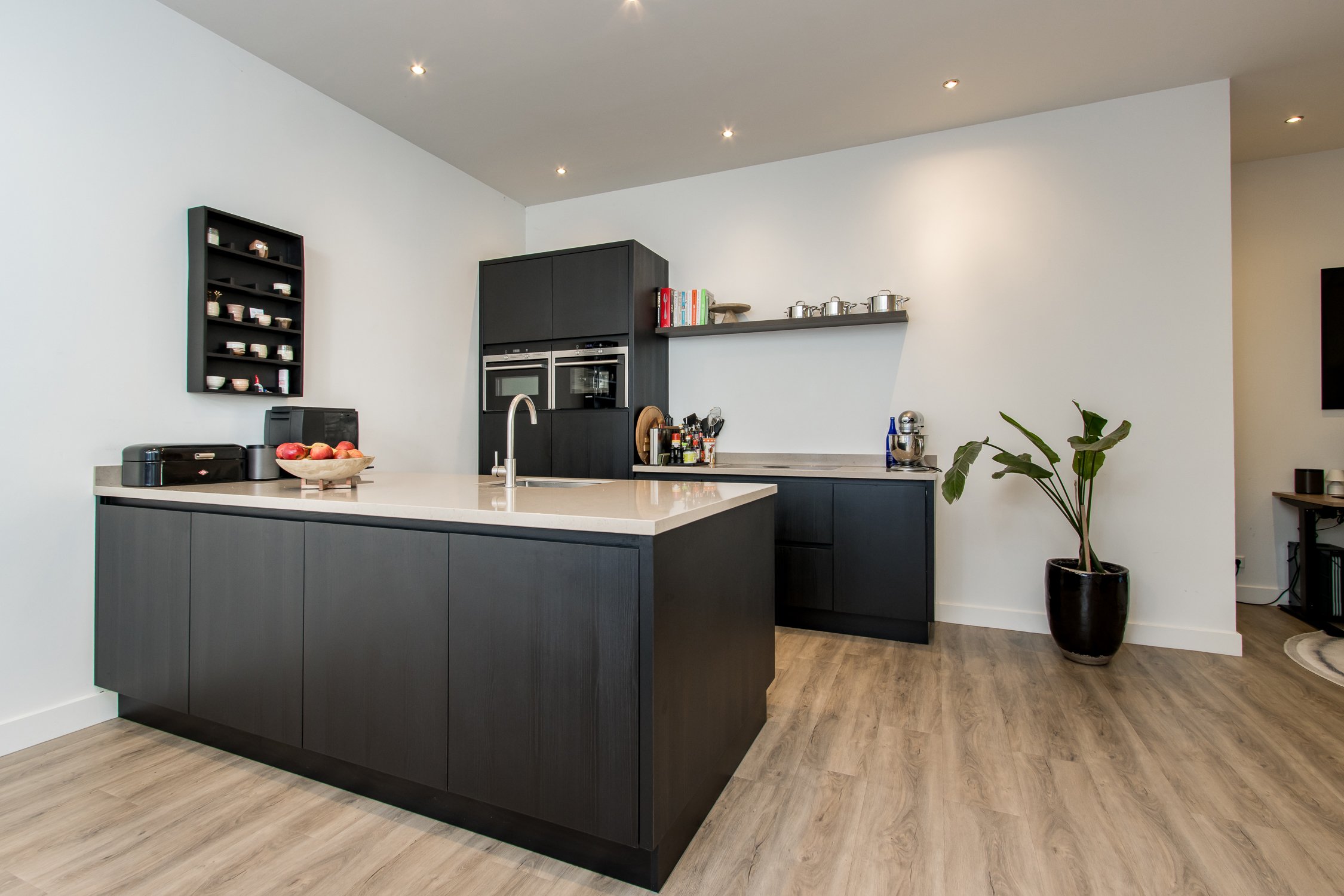• moderne woonkeuken met spoeleiland en ruime eetkamer;