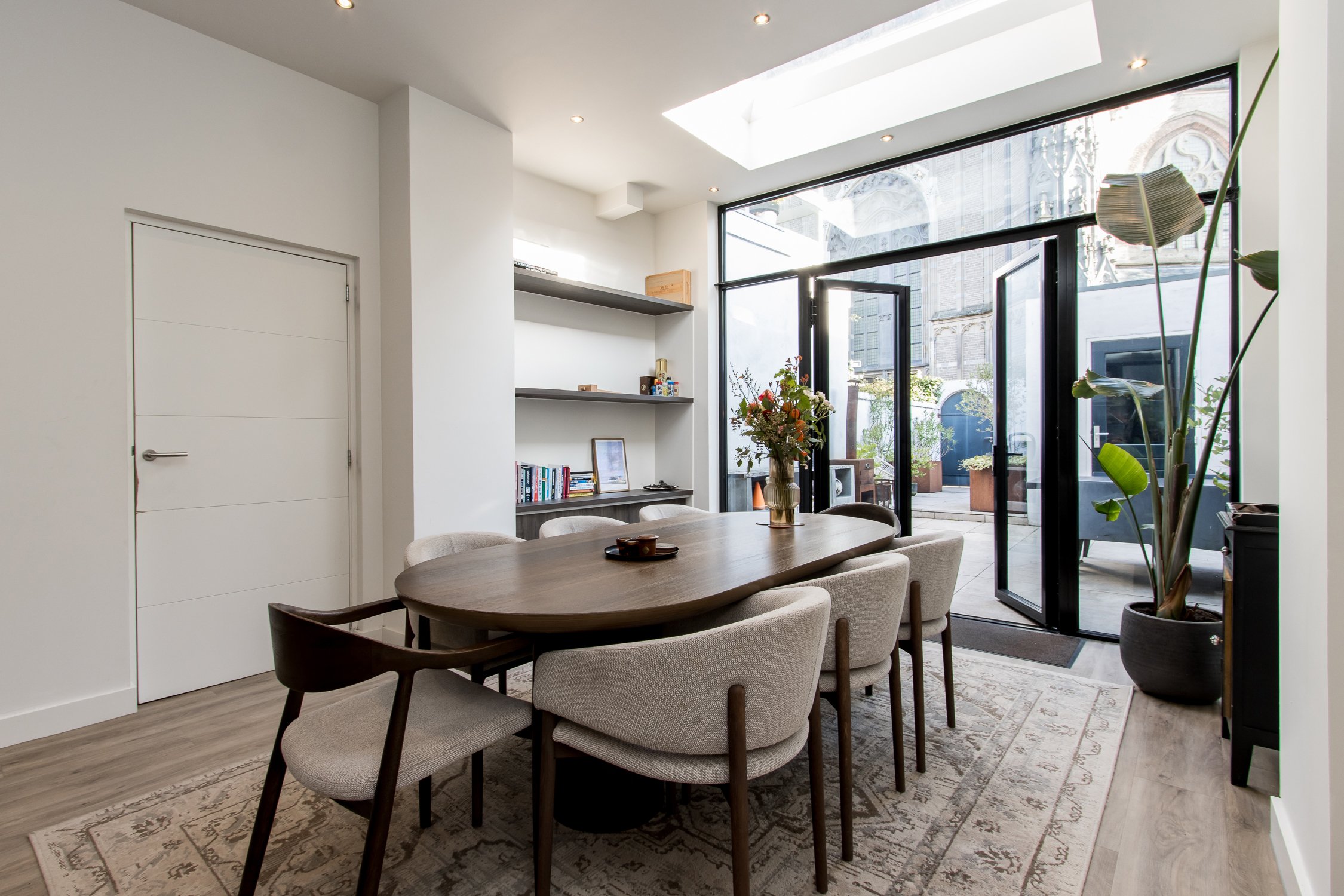 De woonkamer staat in open verbinding met de moderne woonkeuken, uitgevoerd met een stijlvolle vaste kastenwand en een spoeleiland. Aansluitend bevindt zich de ruime eetkamer, waar openslaande deuren direct toegang geven tot de knusse stadstuin. Hier geniet je van een bijzonder uitzicht op de Bommelse toren – een plek om in alle rust te ontspannen of gasten te ontvangen. Via een praktisch portaal met vaste kastruimte – voorzien van aansluiting voor witgoed – is het toilet bereikbaar. Een open trapopgang in de woonkamer leidt naar de eerste verdieping en versterkt het ruimtelijke gevoel van deze lichte en sfeervolle begane grond.