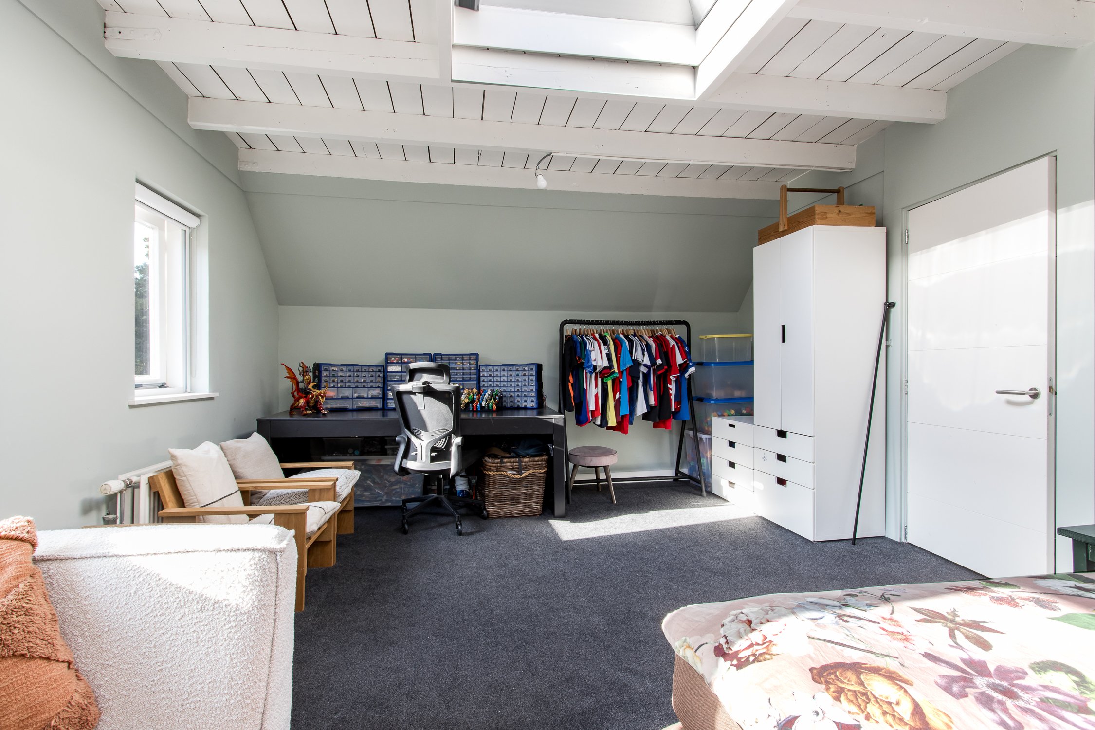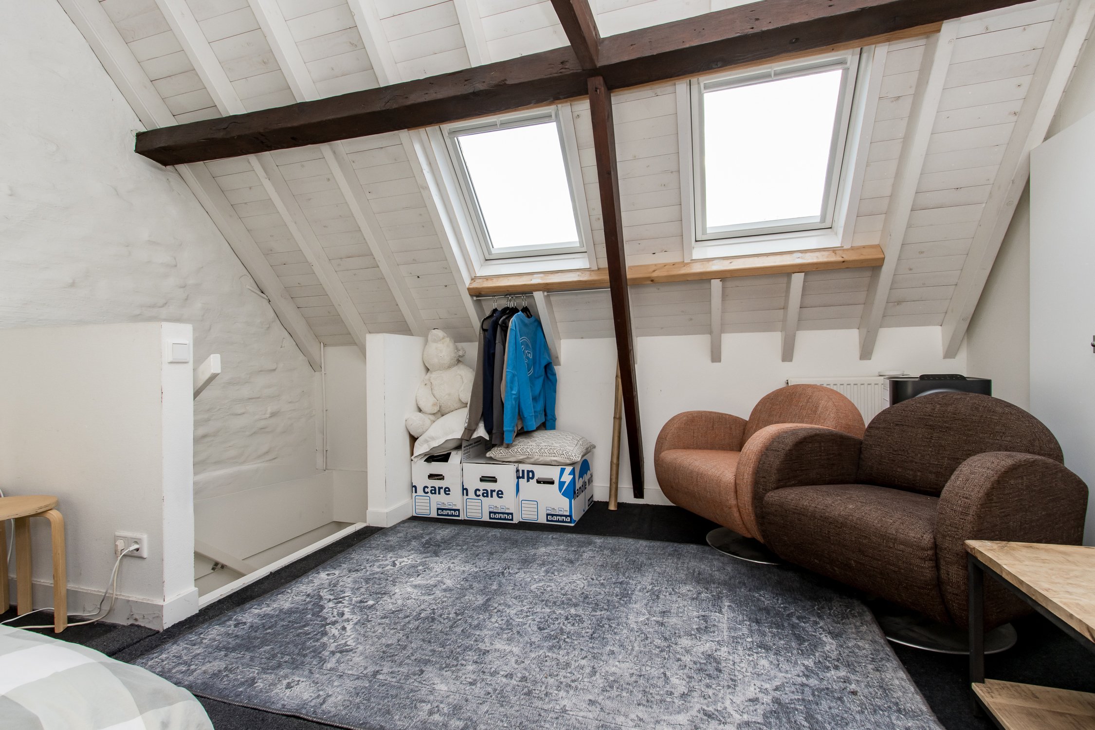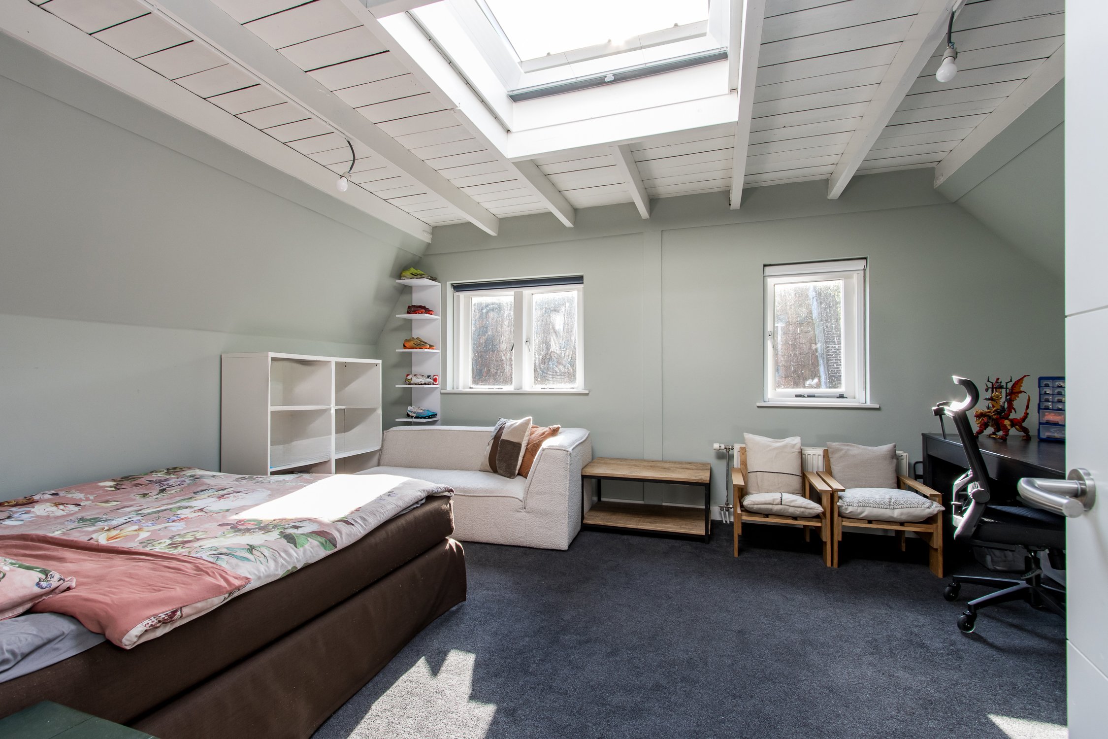 Tweede verdieping: de tweede verdieping biedt een grote, open ruimte met veel lichtinval, dankzij een raam aan de voorzijde en twee dakramen aan de achterzijde. Deze verdieping is veelzijdig te gebruiken en leent zich uitstekend als slaapkamer, hobbyruimte of werkkamer. De open indeling biedt flexibiliteit en creëert een lichte, aangename sfeer, zodat deze verdieping naar wens kan worden ingericht.