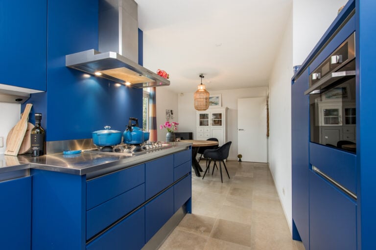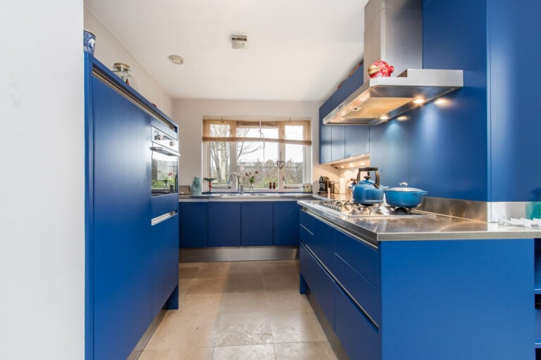 Aansluitend ligt de lichte studeerkamer met toegang tot de veranda. De woonkeuken is ingericht met een luxe opstelling met rvs werkblad, greeploze fronten en diverse inbouwapparatuur. De keuken geeft rechtstreeks toegang tot het terras.