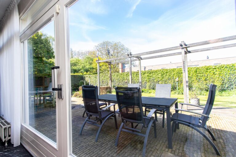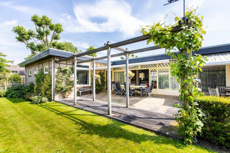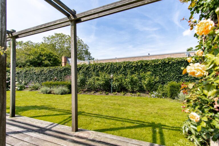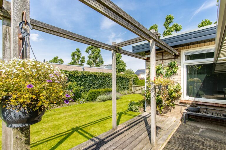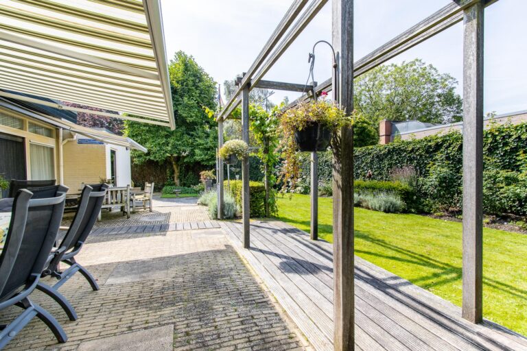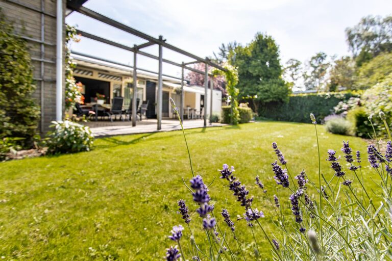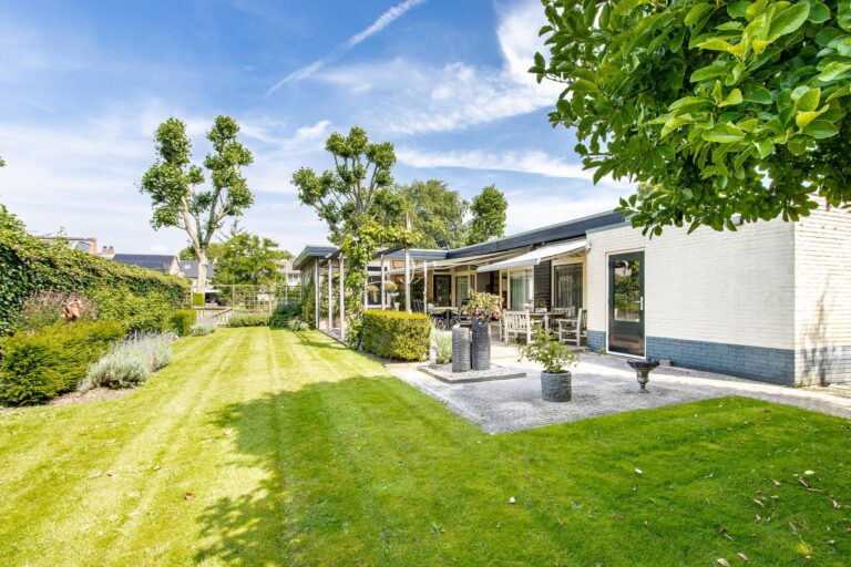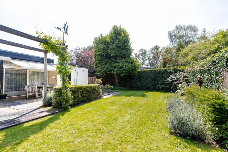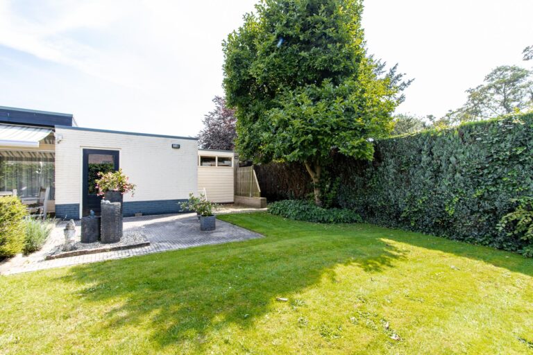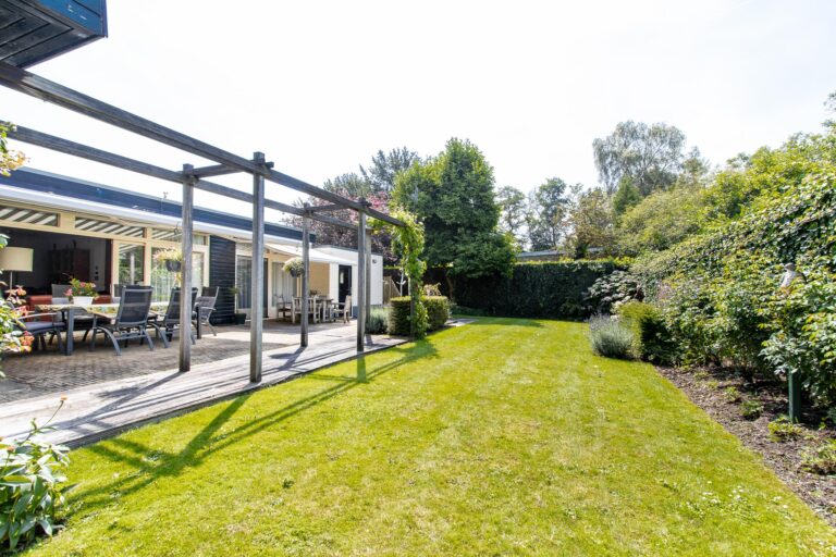 De woning wordt omringd door een weelderige groene tuin met een goed onderhouden gazon met een diversiteit aan beplantingen. Het terras heeft een zonnige ligging op het westen. De aanwezigheid van een dubbele garage met eigen oprit biedt zowel praktisch gemak als een vleugje exclusiviteit aan deze prachtige buitenruimte. Zowel in de zonnige tuin als in de bungalow geniet u optimaal van alle rust & privacy die het riante perceel te bieden heeft.
