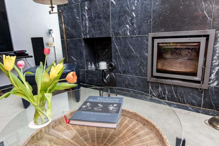 • fraaie onder architectuur ontworpen natuurstenenwand met houtkachel;