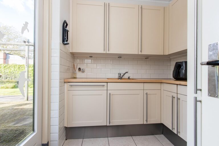 Indeling bungalow: de overdekte entree leidt naar een vestibule met openslaande deuren naar de hal met meterkast. Vanuit de hal zijn de werkkamer en 2 slaapkamers die gelegen zijn aan de voorzijde bereikbaar, evenals een badkamer met douche en wastafelmeubel, een 3e slaapkamer met vaste kast en de toiletruimte. De royale living voorzien van onder architectuur ontworpen natuurstenen wand met houtkachel is bereikbaar vanuit de hal. De woonkamer beschikt over veel raampartijen en een schuifpui, wat zorgt voor veel lichtinval. De keuken is toegankelijk vanuit zowel de hal als de woonkamer en grenst aan een praktische bijkeuken met C.V. kast. Vanuit de woonkamer is er ook toegang tot een portaal met de masterbedroom, voorzien van een schuifpui met directe toegang tot het terras, een berging en een 2e badkamer met ligbad, douche, toilet en wastafelmeubel. Via het portaal is de dubbele garage bereikbaar.