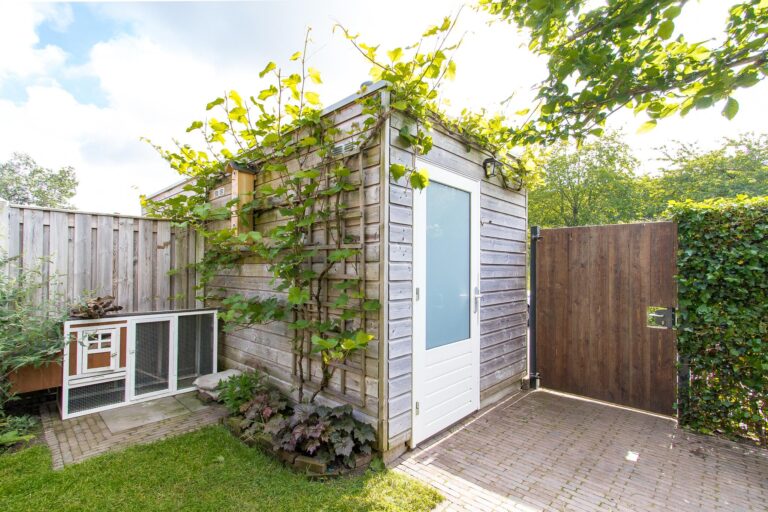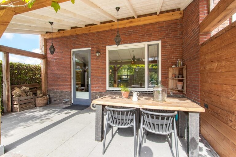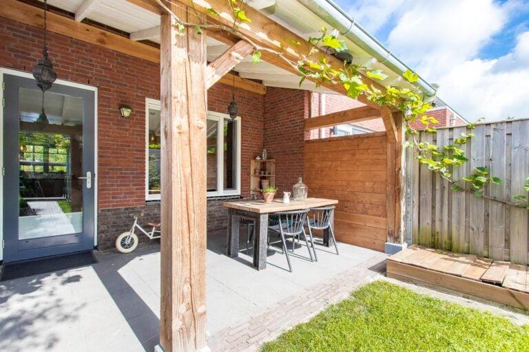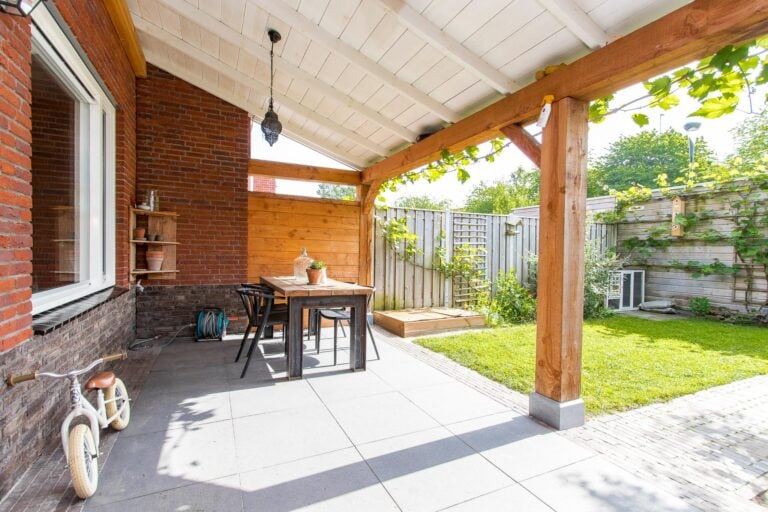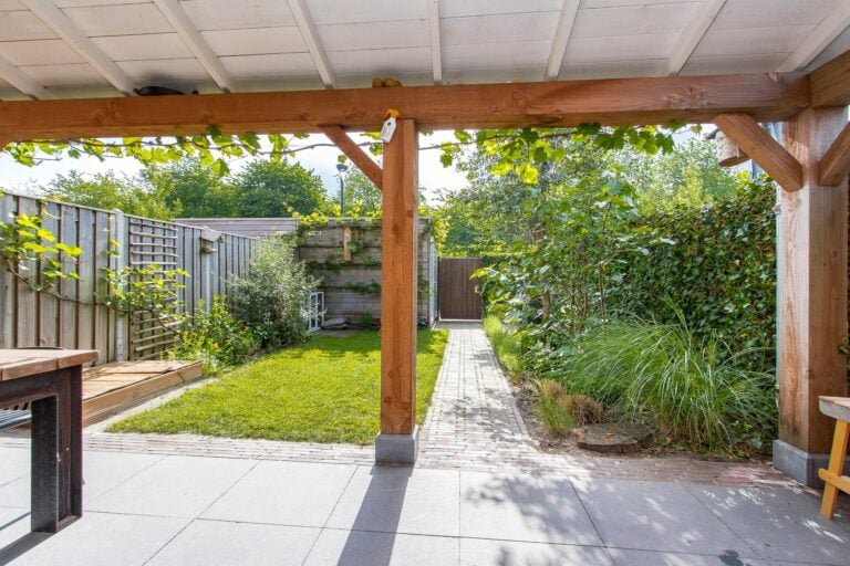 – sfeervolle achtertuin met houten overkapping;
