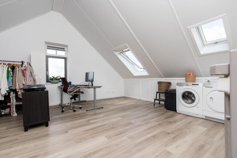 Tweede verdieping: via een vaste trap is de open zolderruimte bereikbaar. Deze ruimte is voorzien van 2 dakvensters en biedt de mogelijkheid om een extra (grote) slaapkamer te realiseren. Hier bevindt zich de C.V.-installatie, witgoedaansluiting, ventilatie-unit en de omvormer van de zonnepanelen.