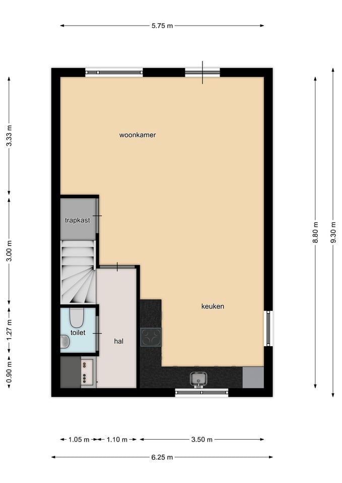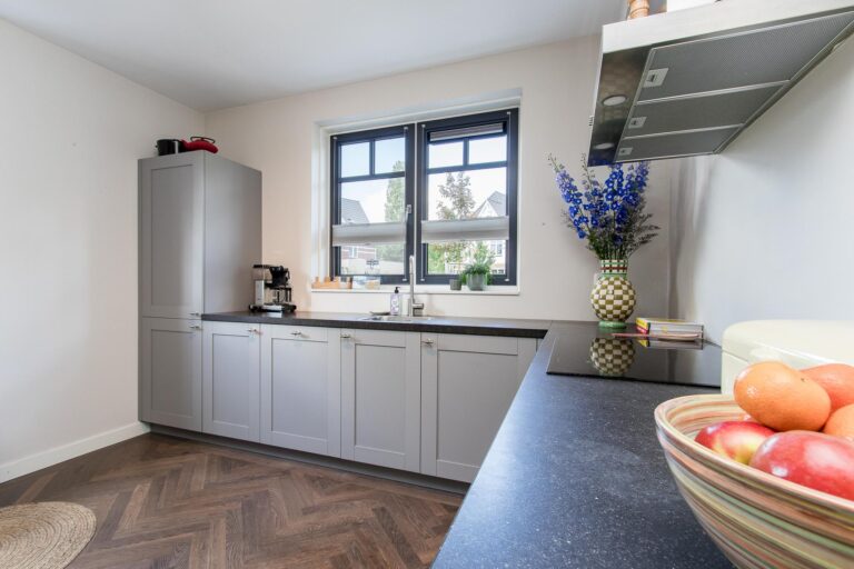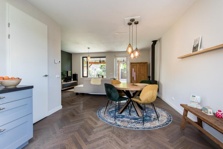 Indeling woonhuis: aan de voorzijde van de woning is de entree gesitueerd. In de hal bevindt zich de meterkast, het toilet en de trapopgang naar de eerste verdieping. De hal geeft toegang tot de sfeervolle woonkamer met loopdeur naar de achtertuin. De woonkamer heeft een open verbinding met de fraaie keuken v.v. L-vormige keukenunit met diverse inbouwapparatuur waaronder een inductie kookplaat, oven, combi-/oven, koel-vriescombinatie en vaatwasser.