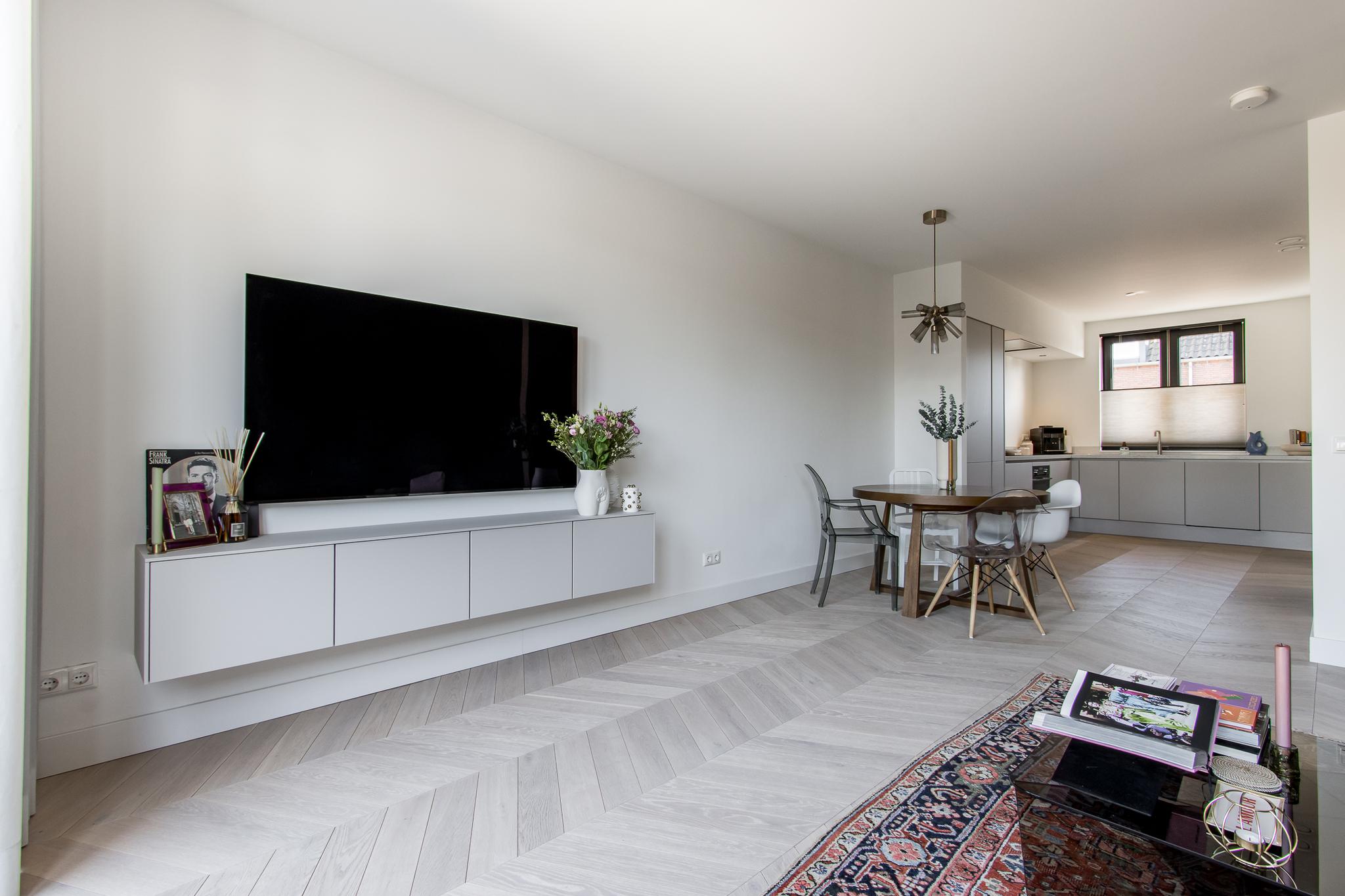 Indeling van de woning: de entree biedt toegang tot de hal met garderobe, meterkast en toiletruimte. Vanuit de hal stap je de moderne keuken binnen, die in open verbinding staat met de tuingerichte woonkamer. Deze lichte en ruime living is voorzien van een praktische trapkast met installatieruimte en openslaande deuren naar het terras. De keuken is uitgerust met een hoekopstelling en diverse inbouwapparatuur van Siemens, waaronder een inductiekookplaat, afzuigkap, combi-oven, vaatwasser, koelkast met vriezer en Quooker.