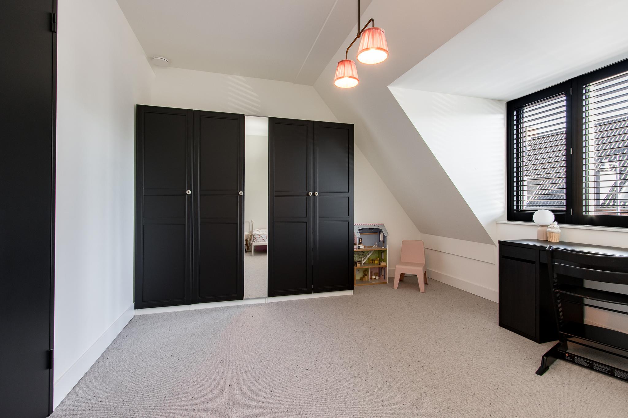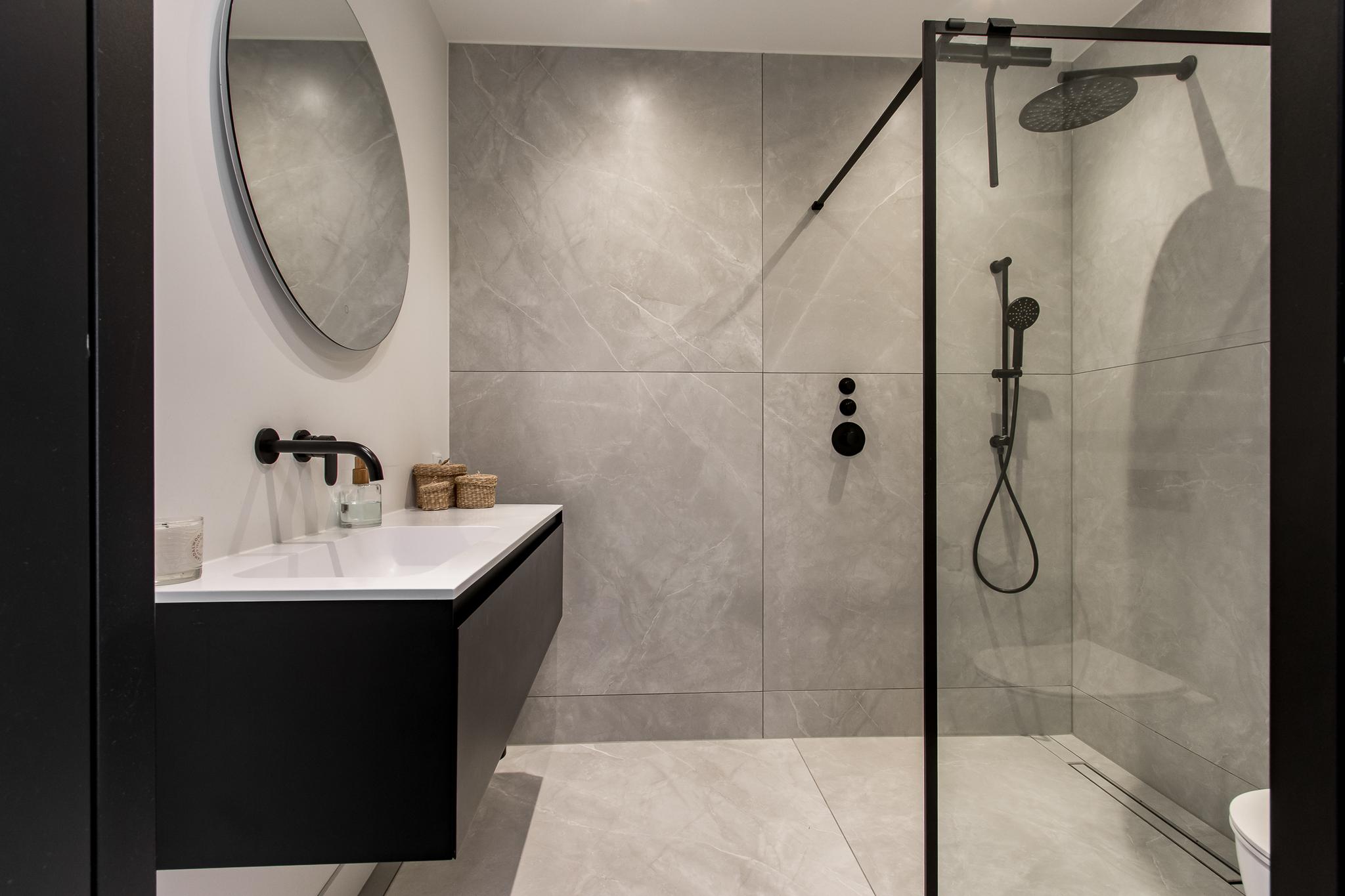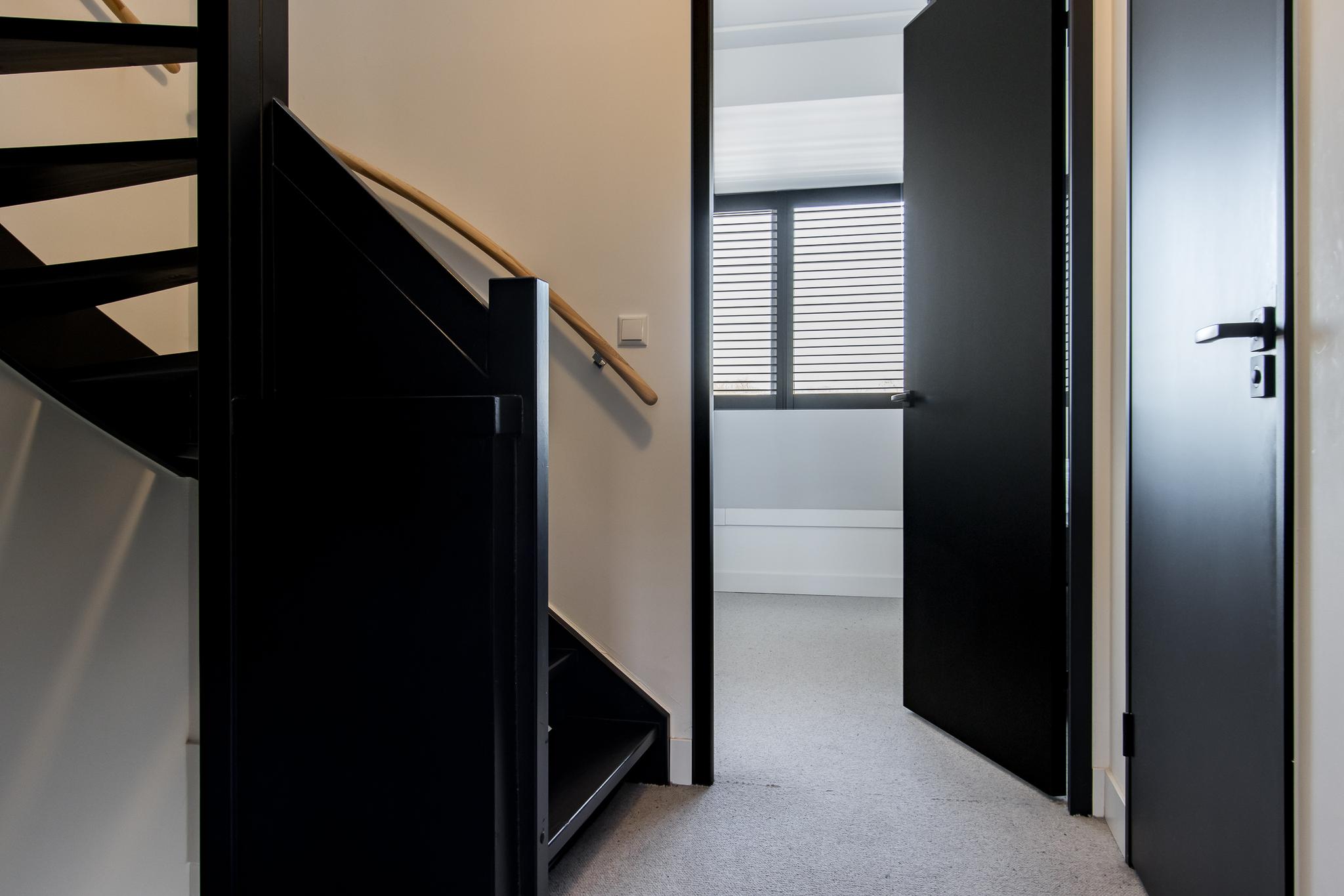 Eerste verdieping: de overloop geeft toegang tot twee ruime slaapkamers en een moderne badkamer, compleet met inloopdouche, wastafelmeubel en tweede toilet.
