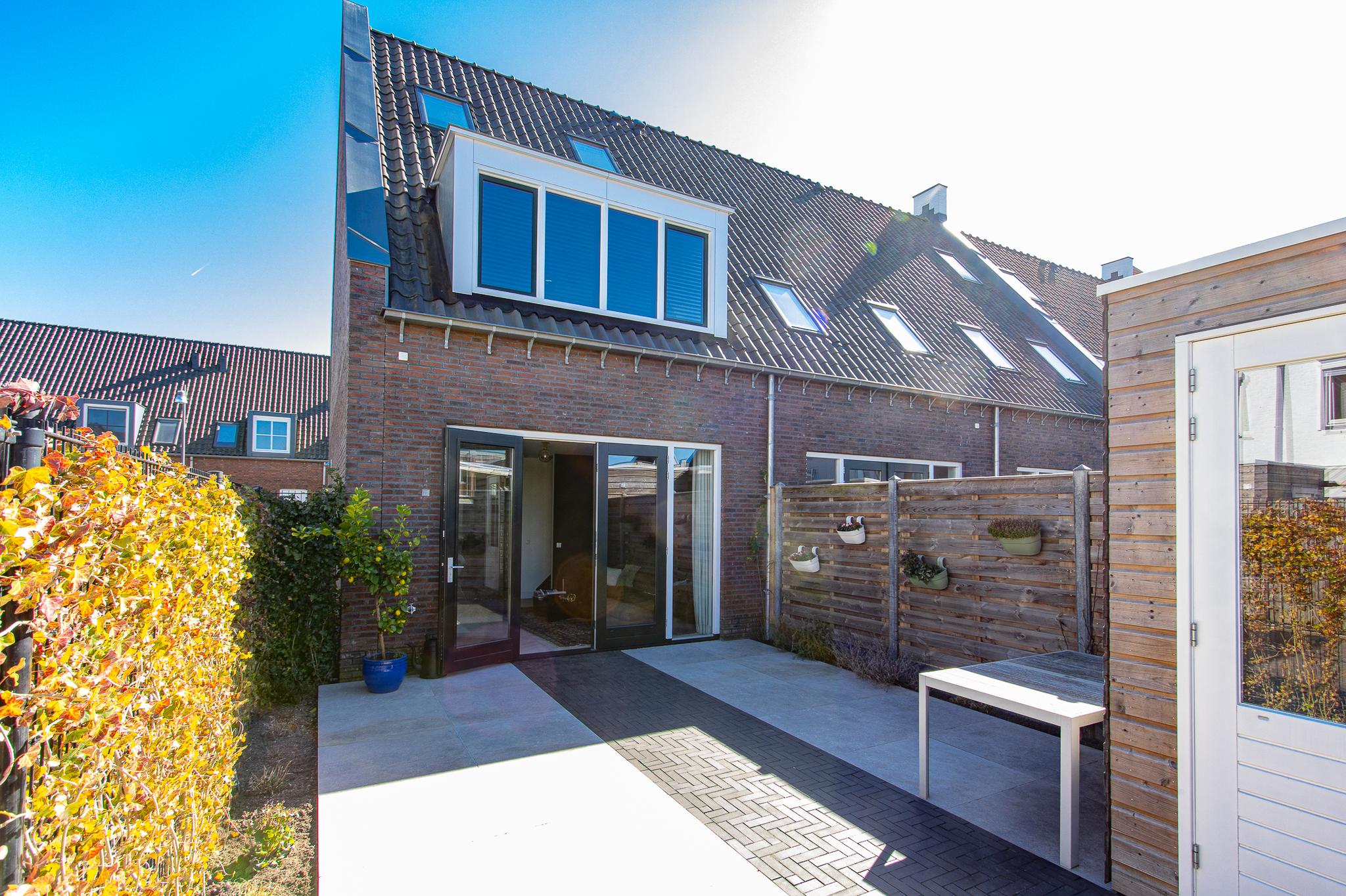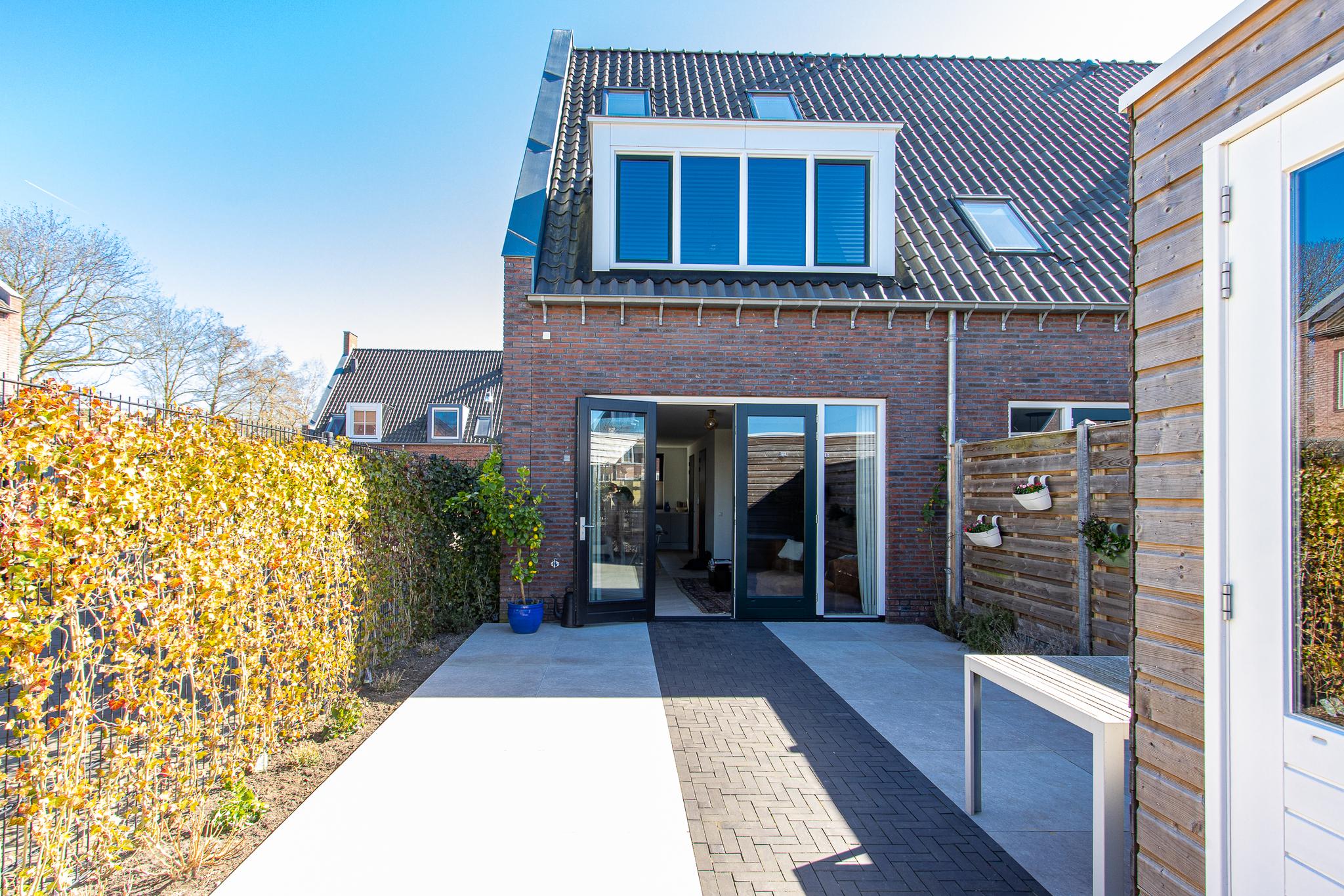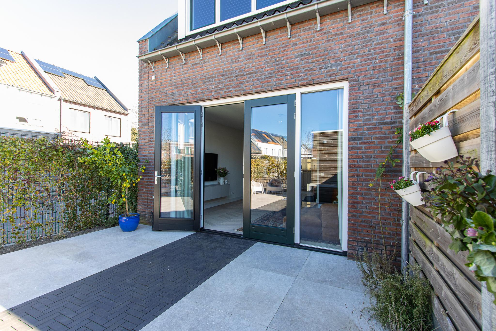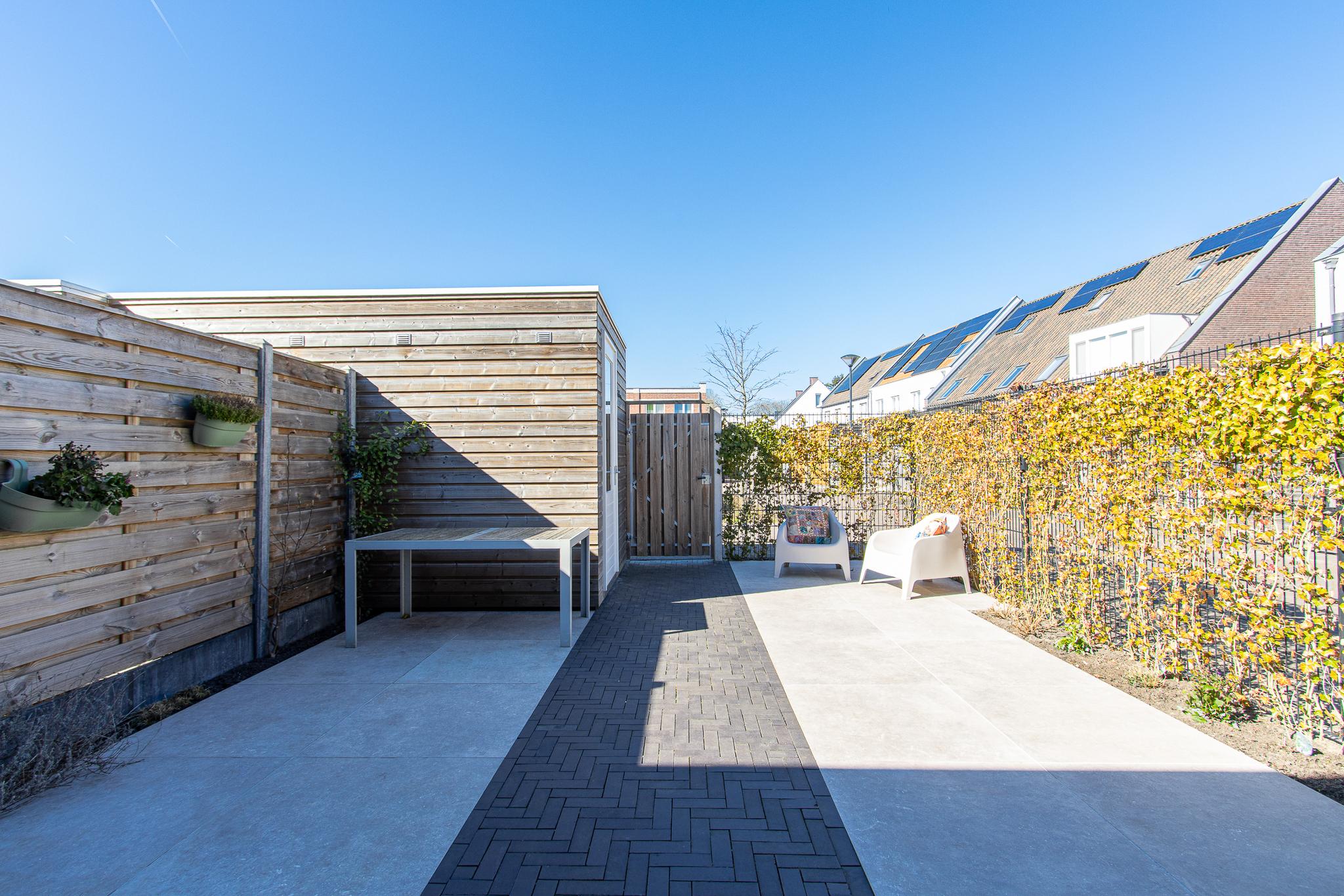 Buiten wacht een heerlijke tuin op het noordwesten, perfect voor de middag- en avondzon. De tuin is strak en sfeervol aangelegd met moderne terrastegels en gebakken klinkers. Een houten schutting zorgt voor beschutting, terwijl de weelderige hedera extra groen en privacy biedt. Via de praktische achterom kom je direct uit op een ruime parkeerplaats.